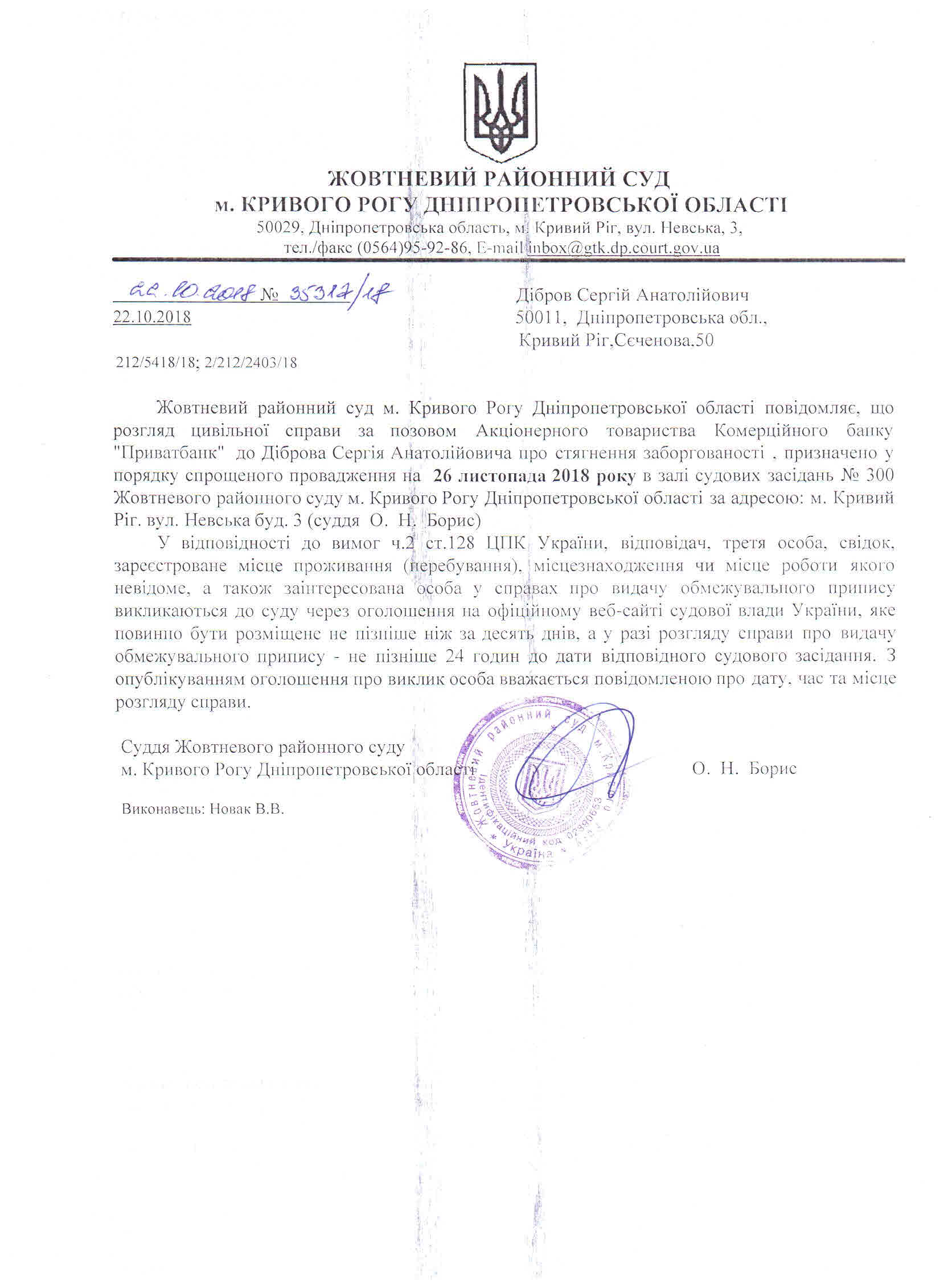 Оголошення про виклик до суду Дібров Сергій Анатолійович