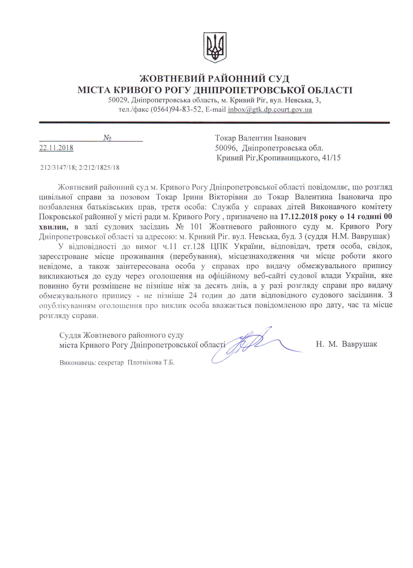 Оголошення про виклик до суду Токар Валентин Іванович