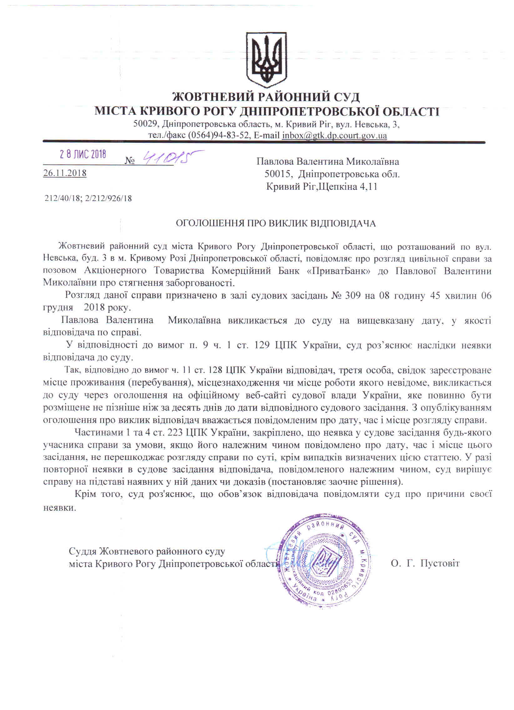 Оголошення про виклик до суду Павлова Валентина Миколаївна