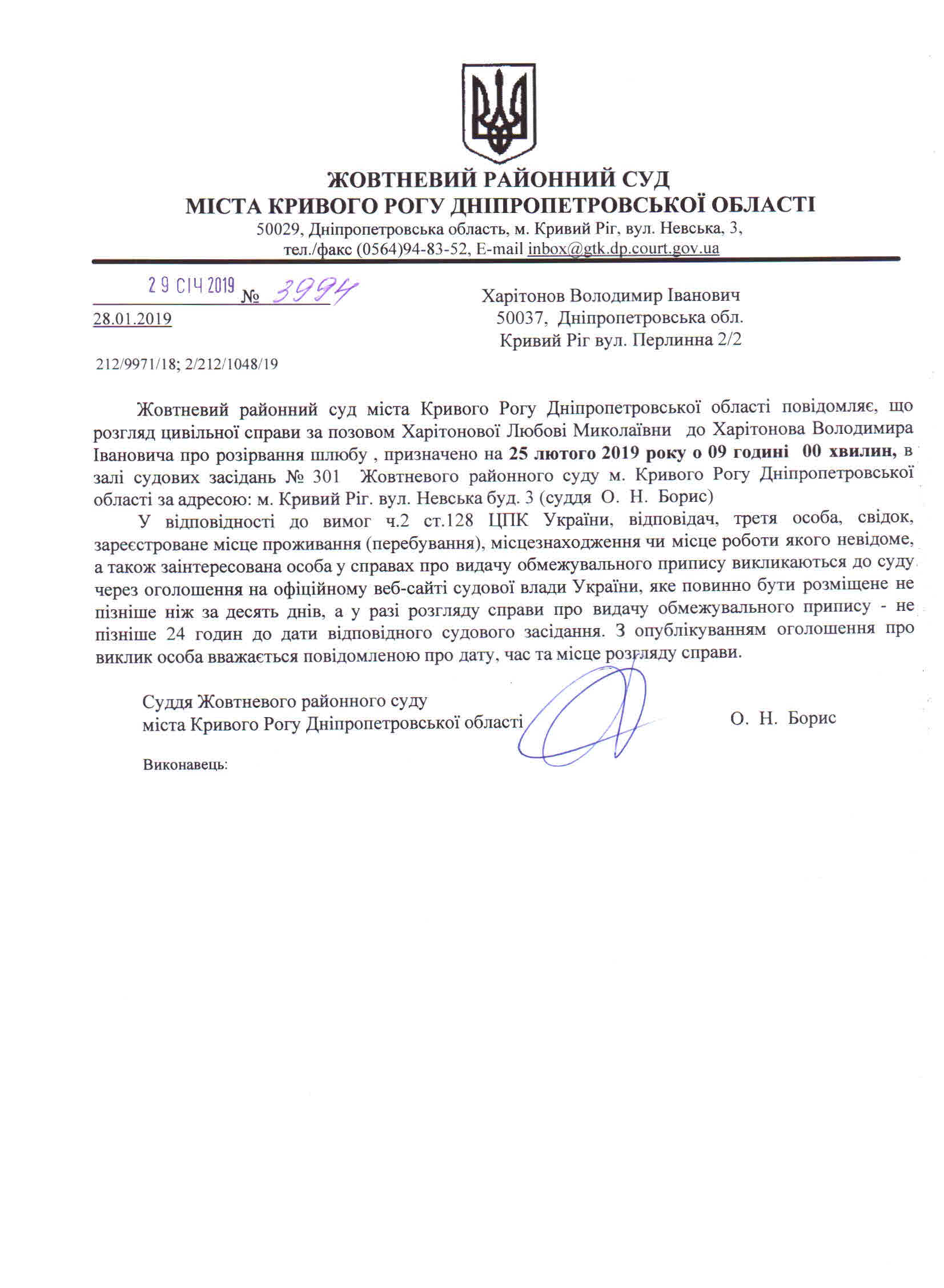 Оголошення про виклик до суду Харітонов Володимир Іванович