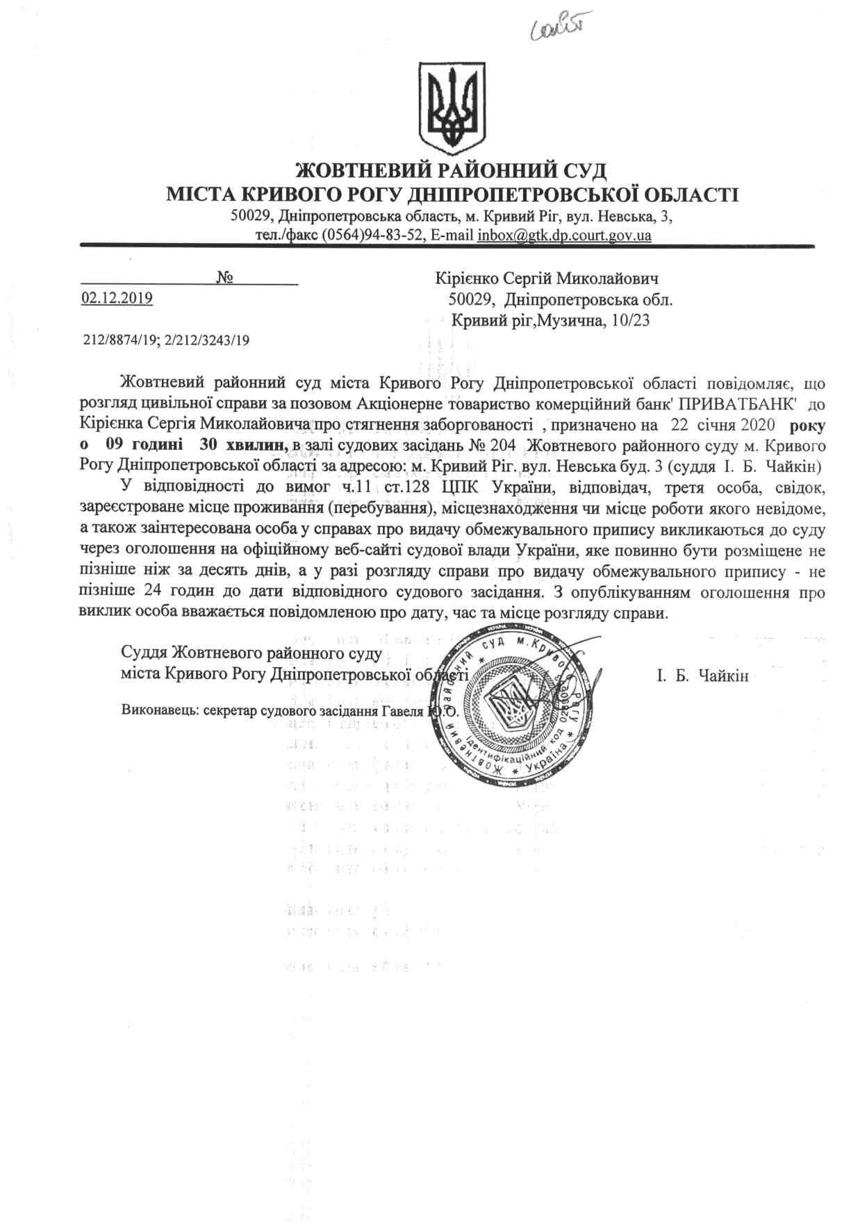 Оголошення про виклик до суду Кірієнко Сергій Миколайович
