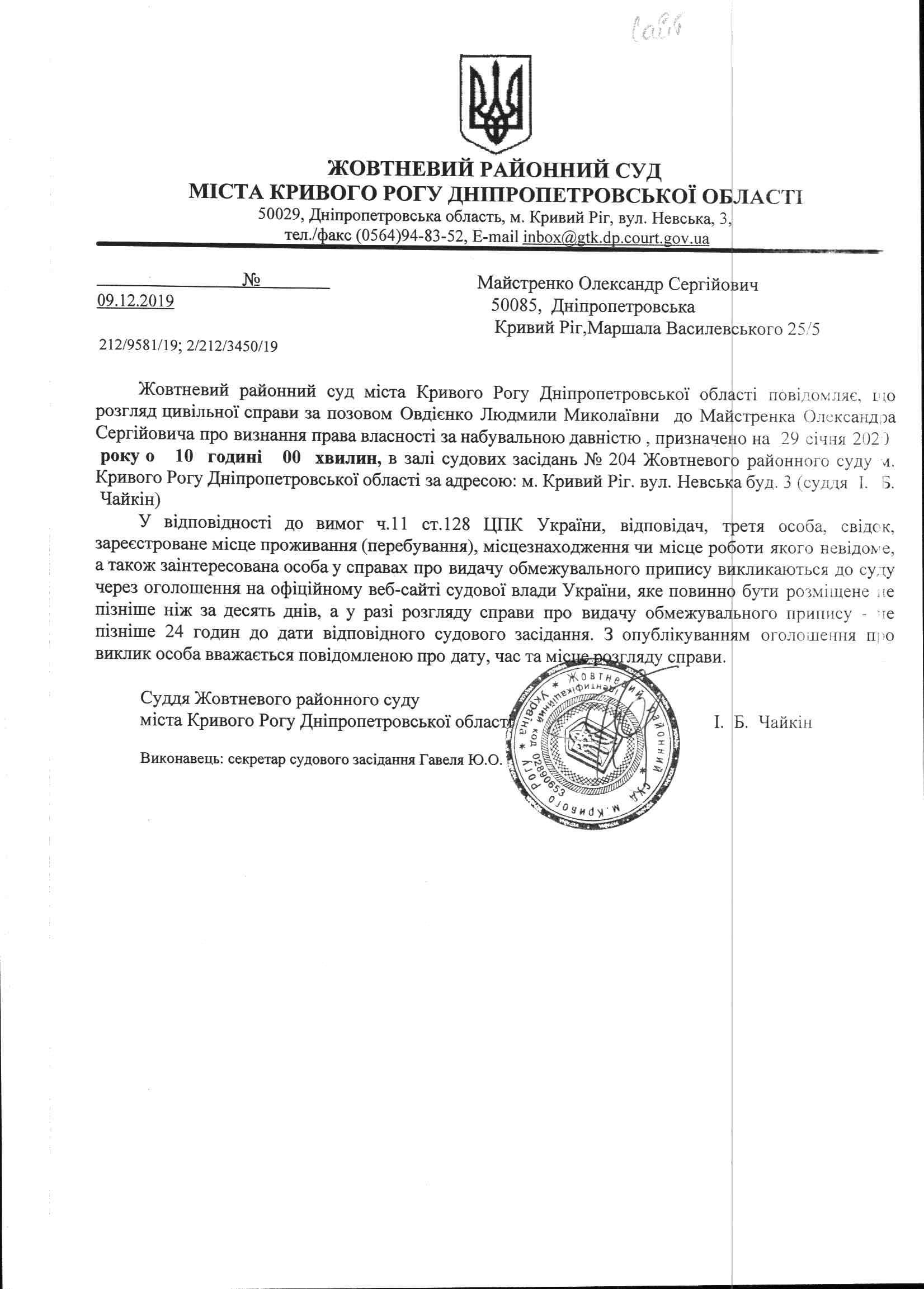 Оголошення про виклик до суду Майстренка Олександра Сергійовича