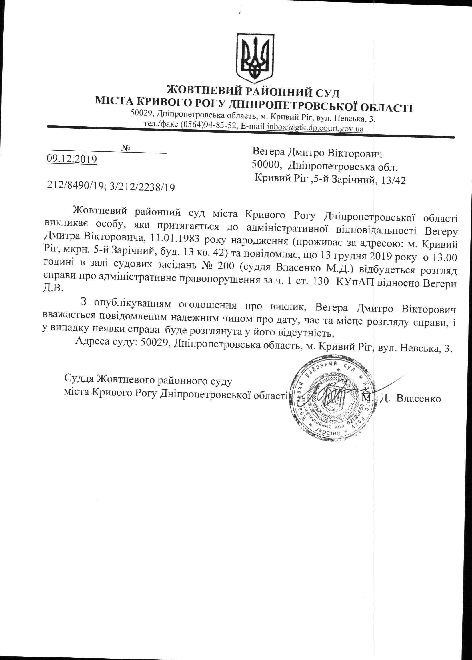 Оголошення про виклик до суду Вегери Дмитра Вікторовича
