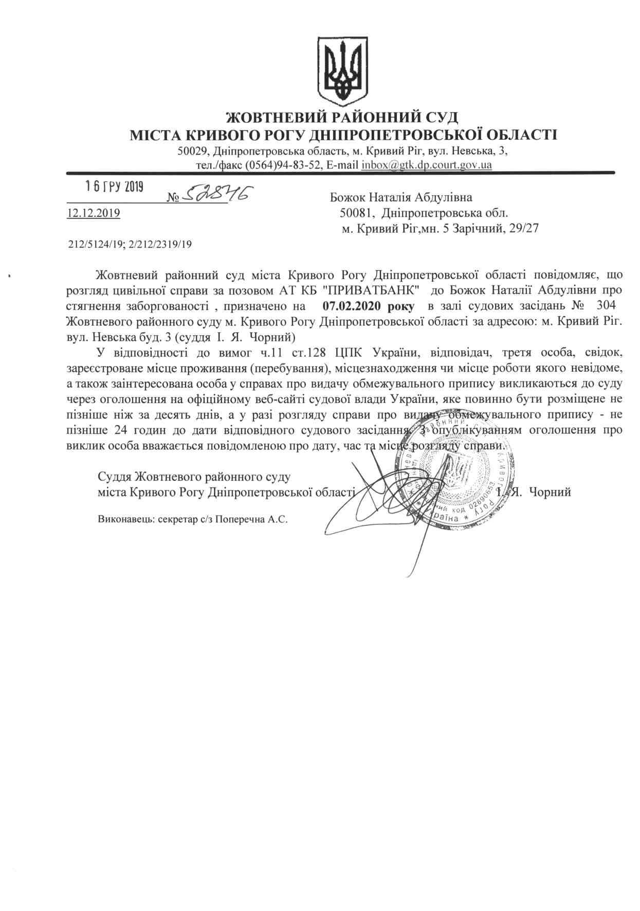 Оголошення про виклик до суду Божок Наталія Абдулівна
