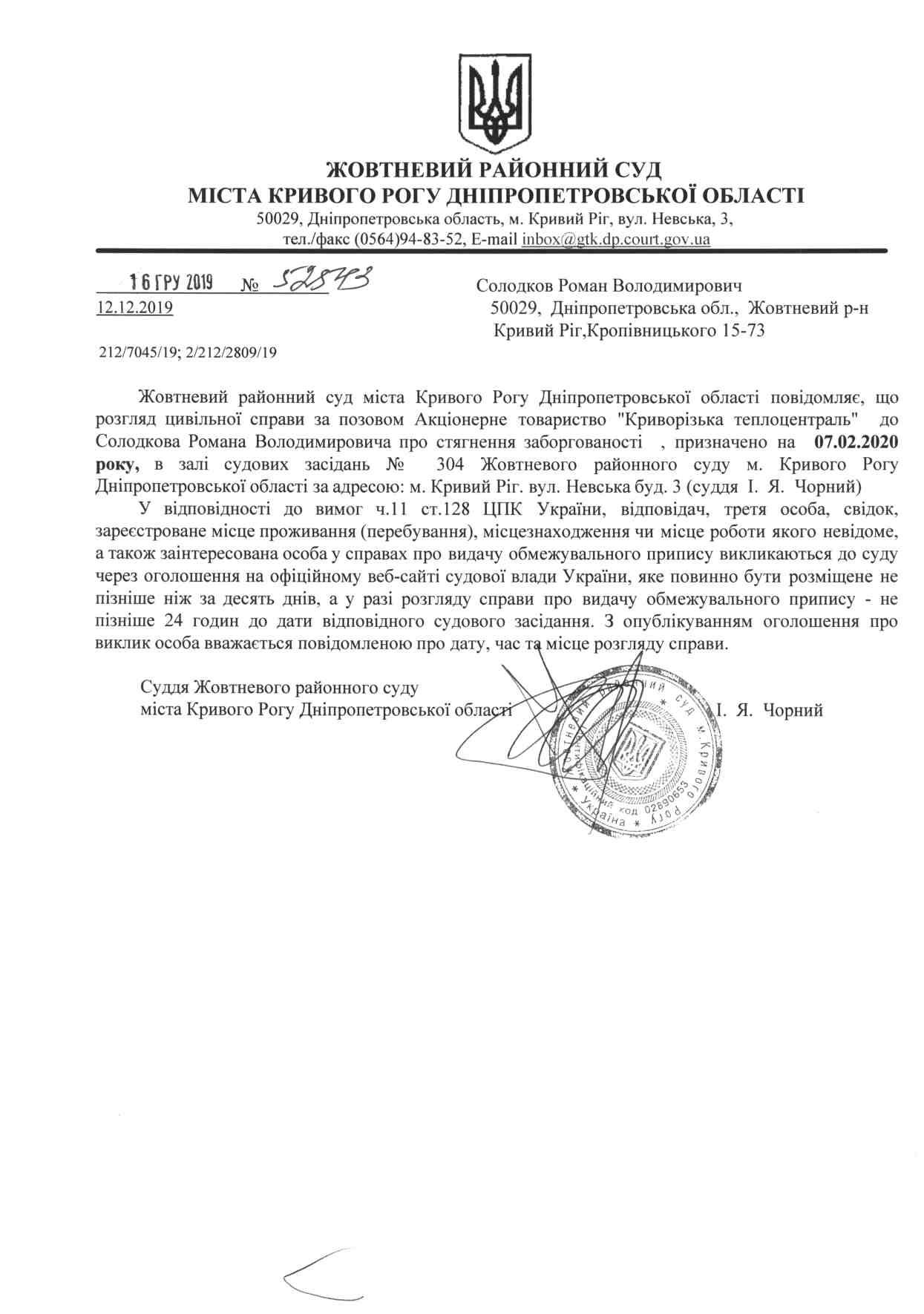 Оголошення про виклик до суду Солодков Роман Володимирович