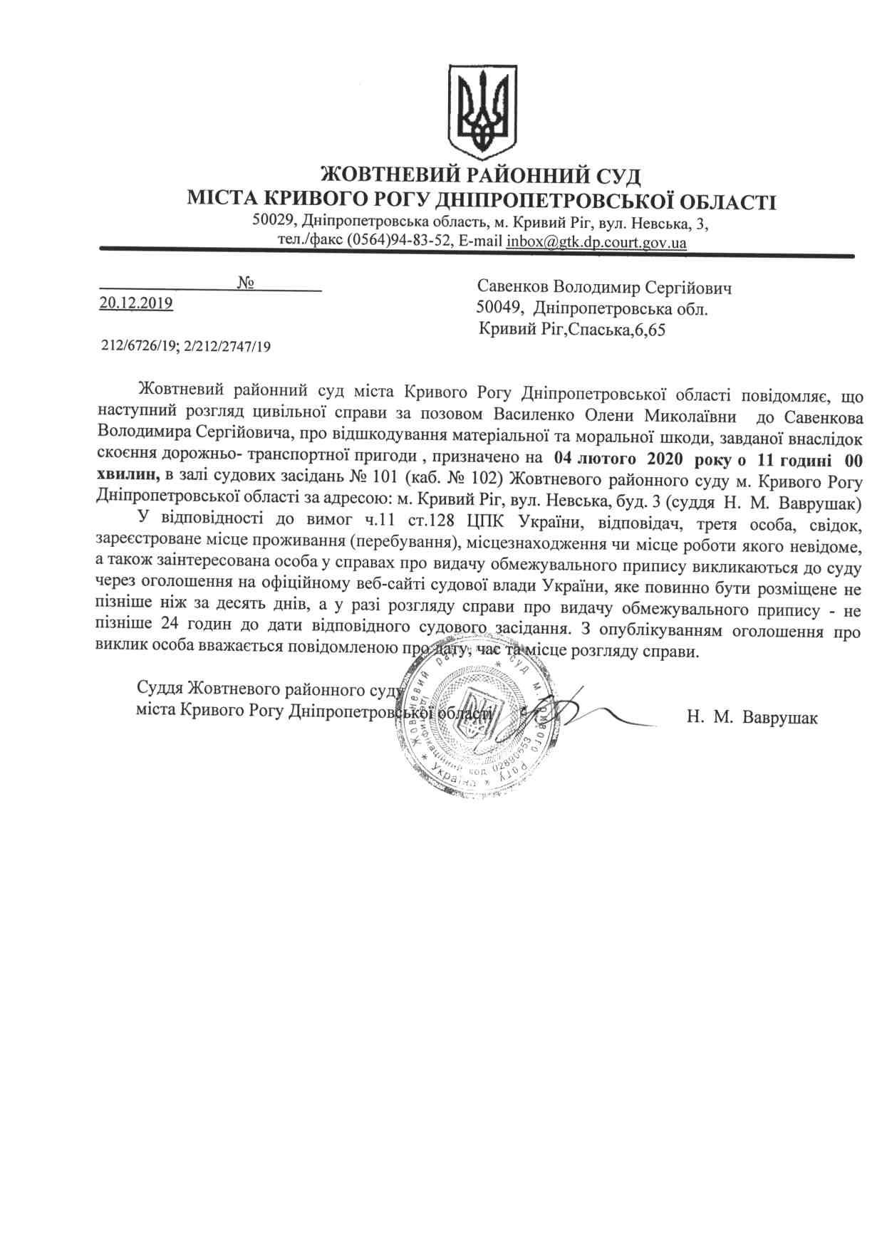 Оголошення про виклик до суду Савенков Володимир Сергійович