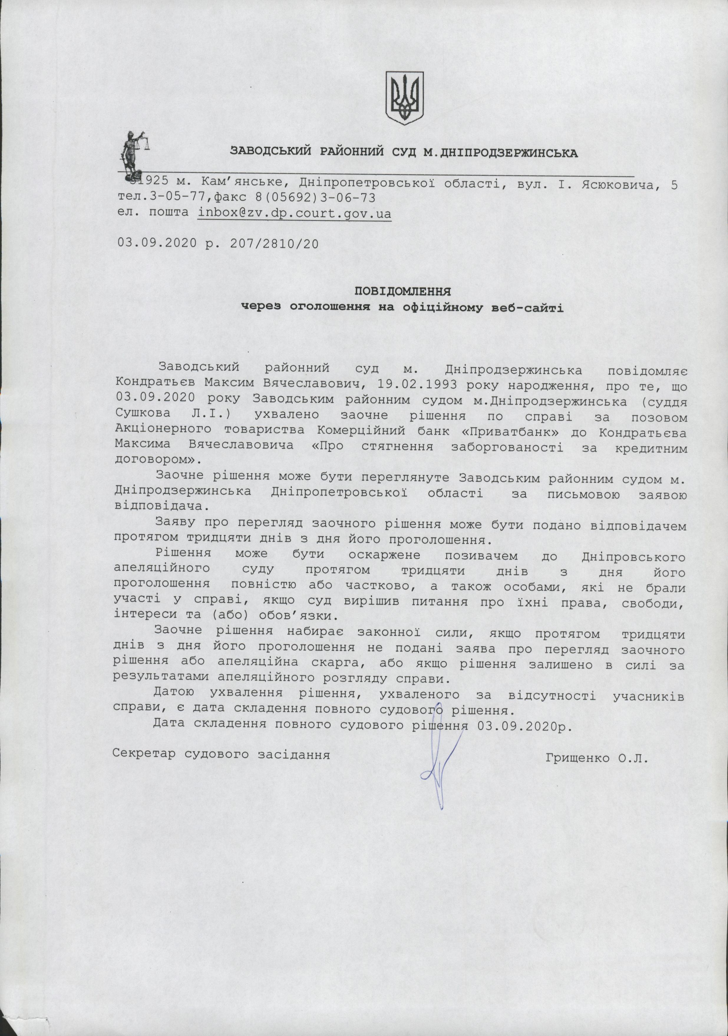 Повідомляємо Кондратьєва Максима В'ячеславовича, 19.02.1993 р.н про винесення заочного рішення суду