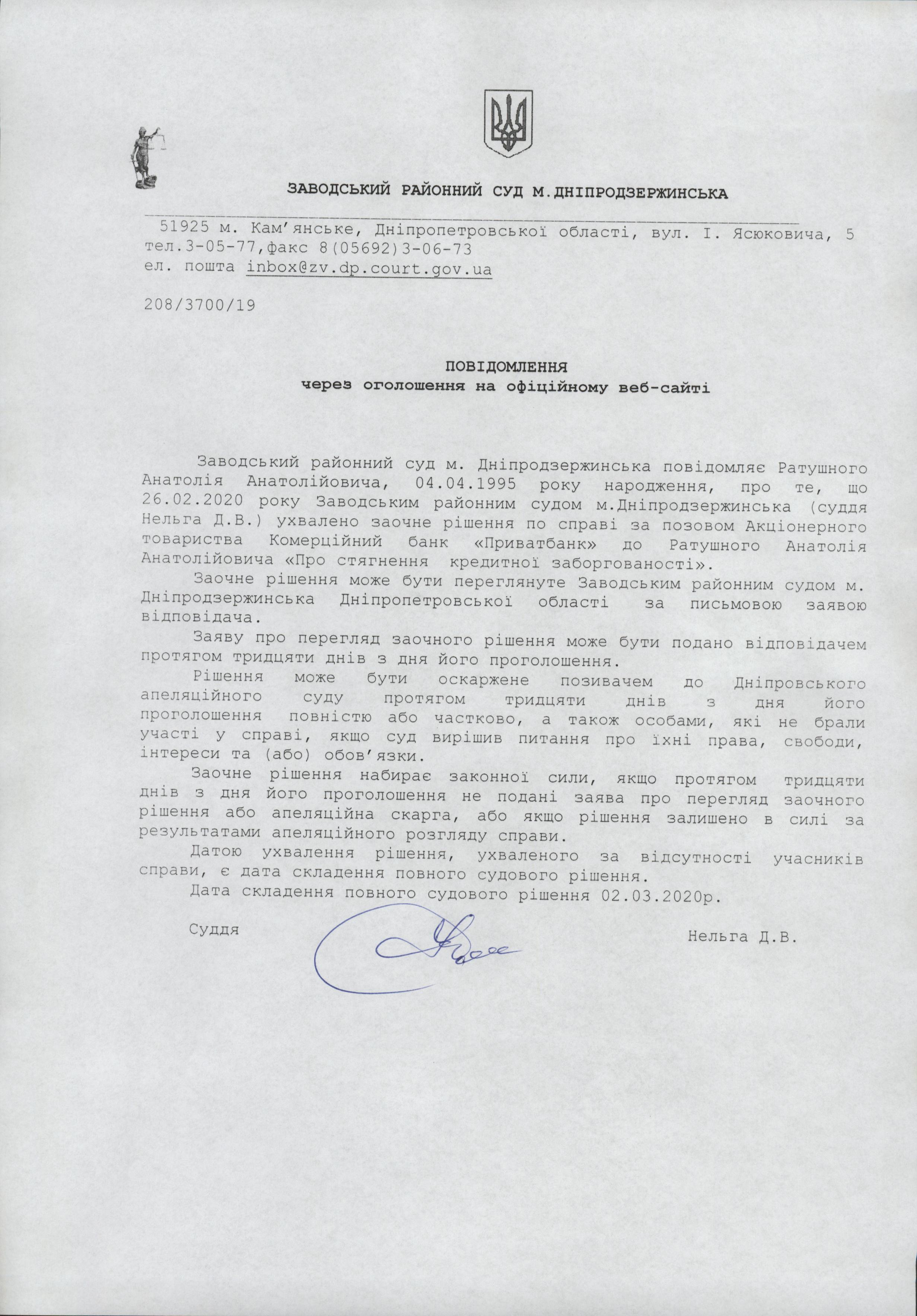 Повідомляється Ратушний Анатолій Анатолійович, 04.04.1995 р.н про винесення заочного рішення