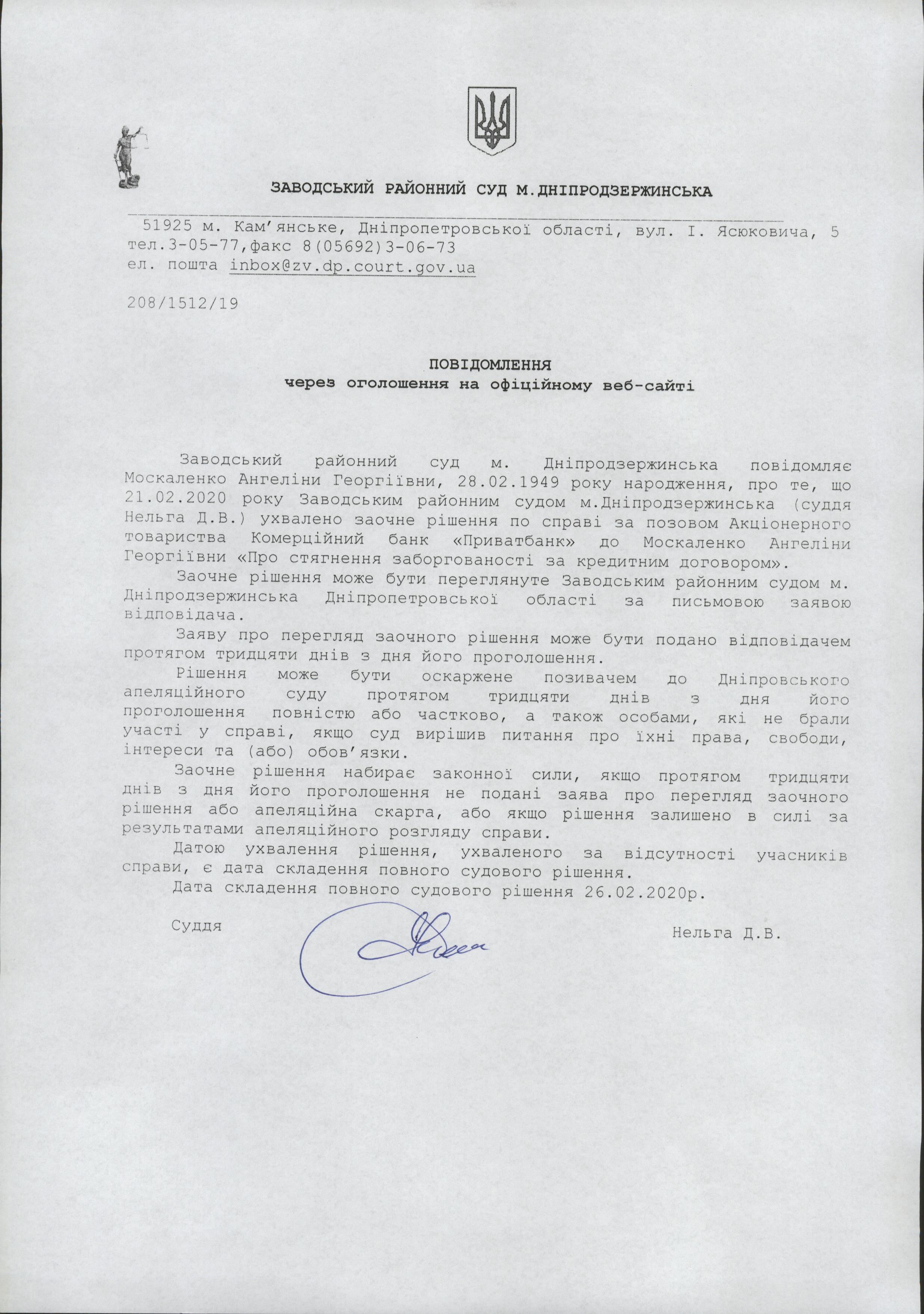 Повідомляється Москоленко Ангеліна Георгіївна, 28.02.1949 р.н про винесення заочного рішення