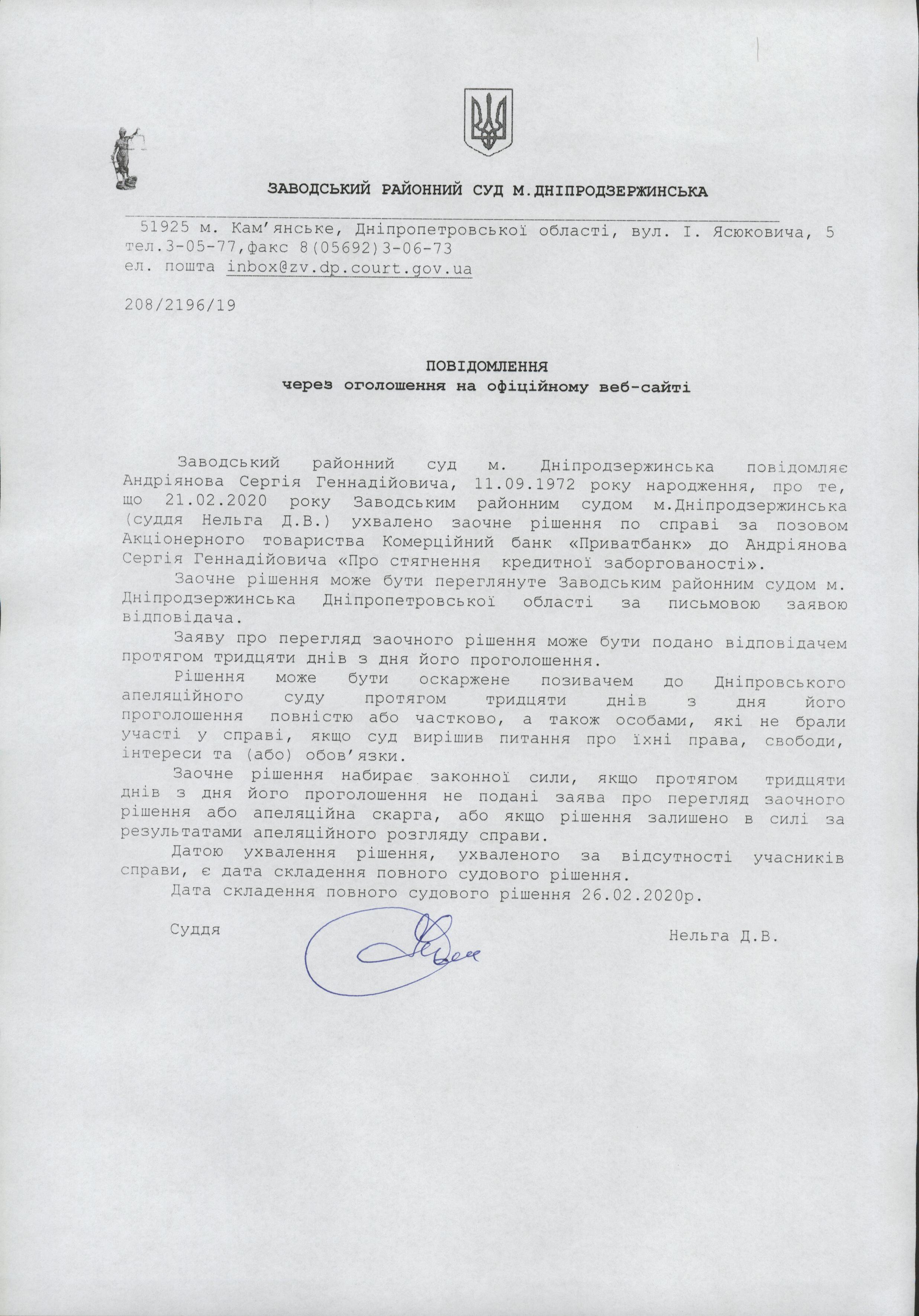 Повідомляється Андріянов Сергій Геннадійович, 11.09.1972 р.н про винесення заочного рішення