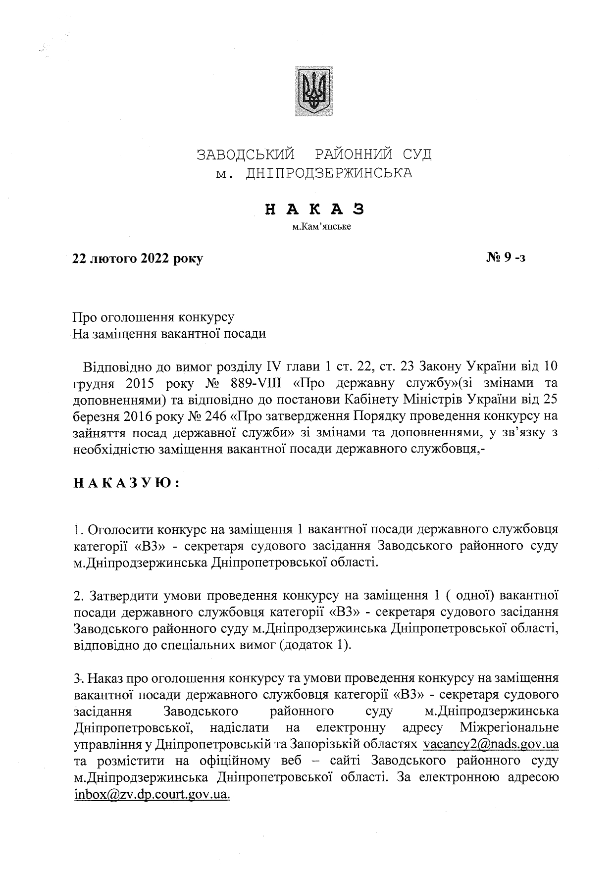 Наказ № 9-з від 22 лютого 2022 року «Про проведення конкурсу на зайняття посад державної служби»
