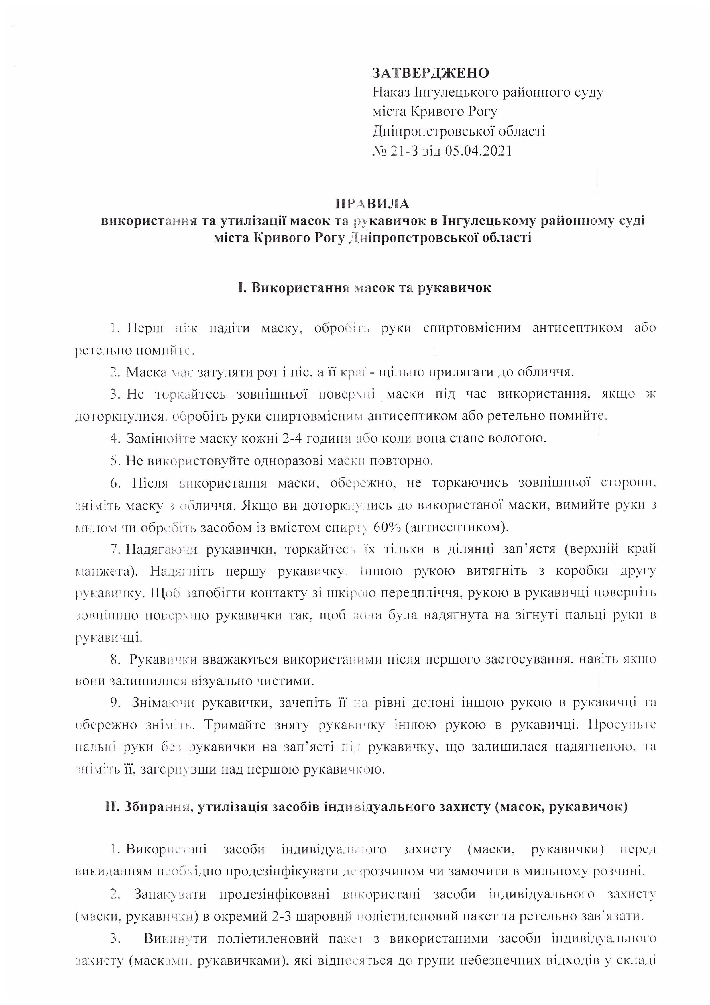 Затверджені Правила використання та утилізації масок та рукавичок в Інгулецькому районному суді міста Кривого Рогу Дніпропетровської області від 05.04.2021