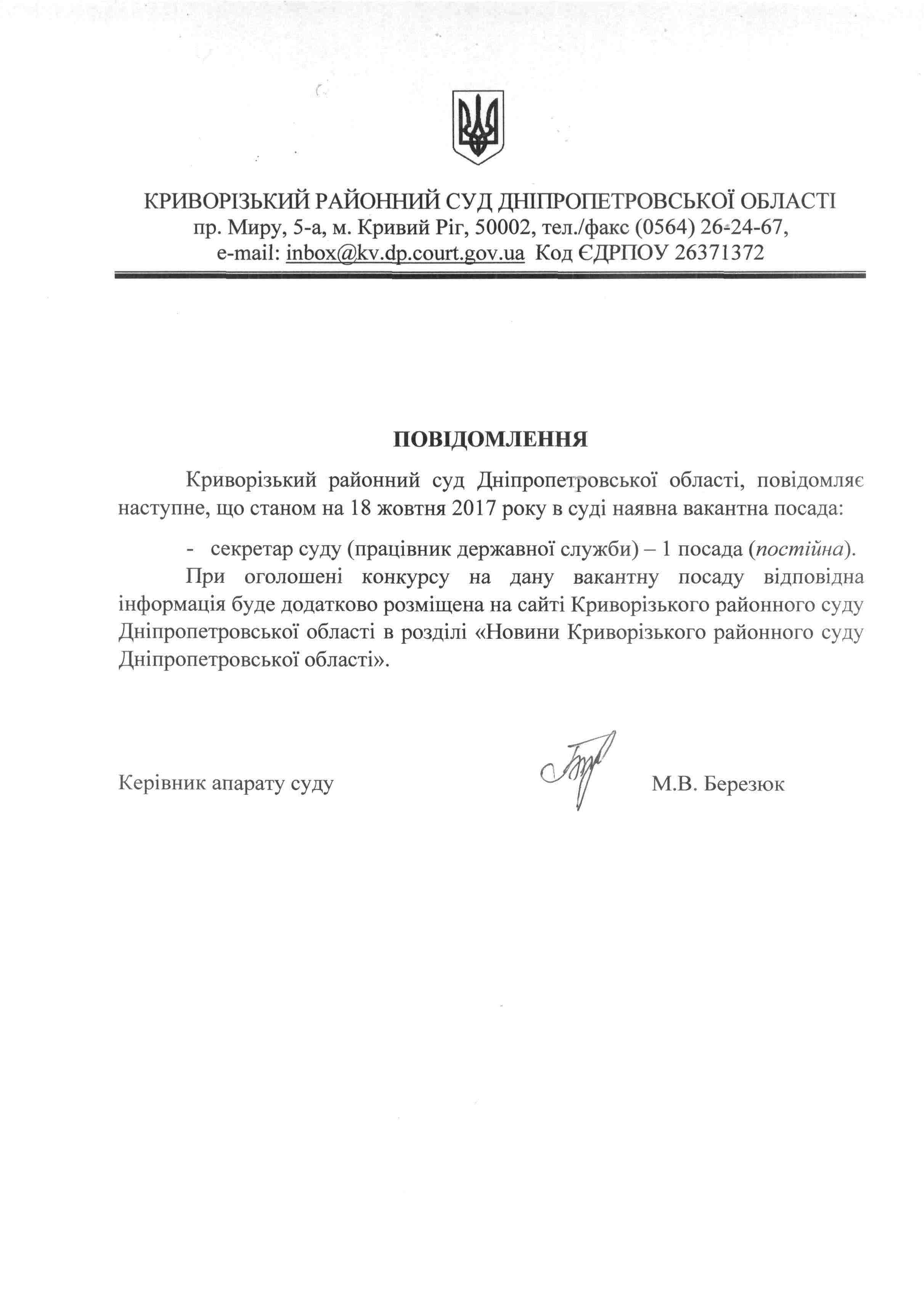 Інформація про вакантну посаду секретаря суду