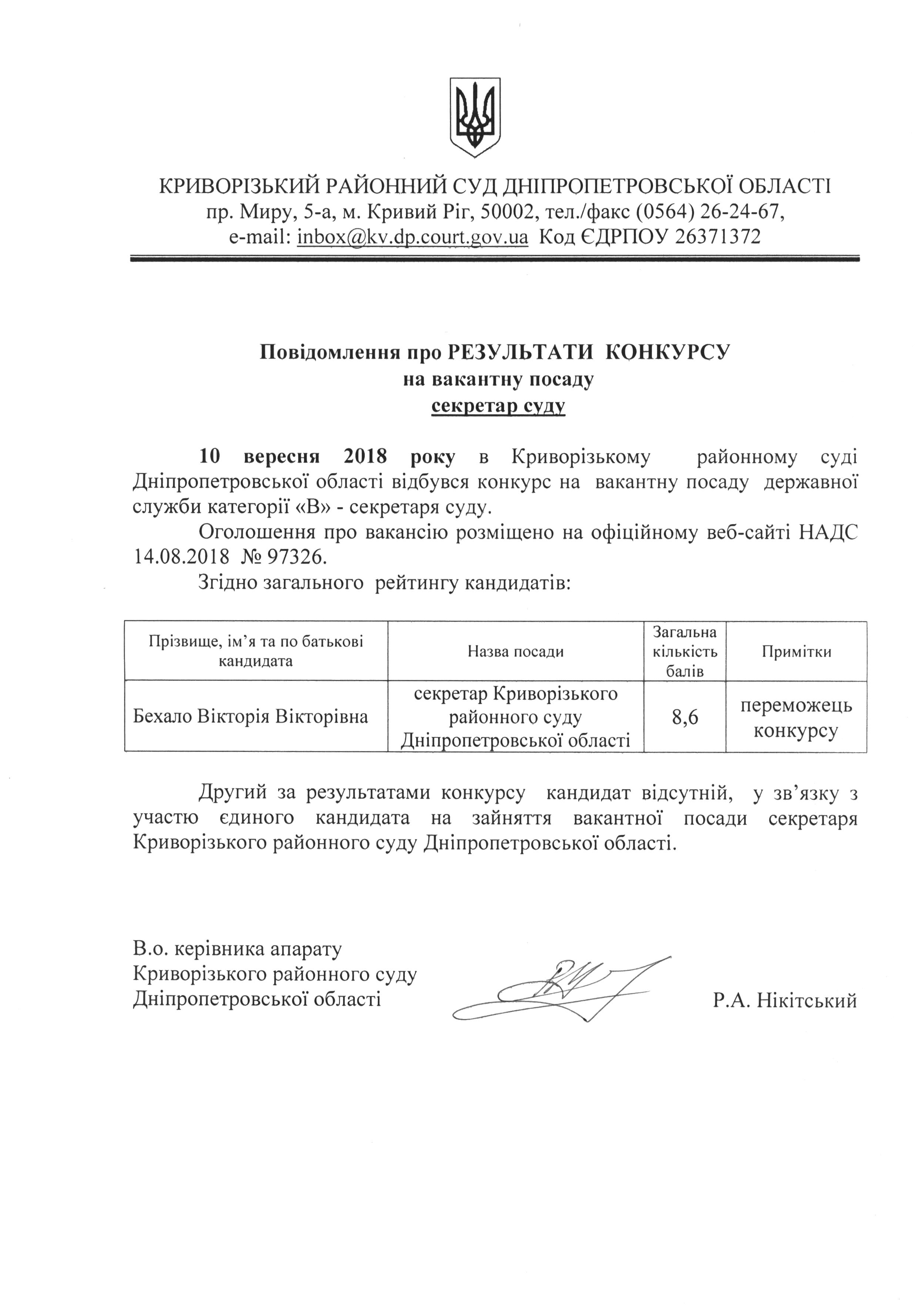 Повідомлення про результати конкурсу на вакантну посаду секретар суду