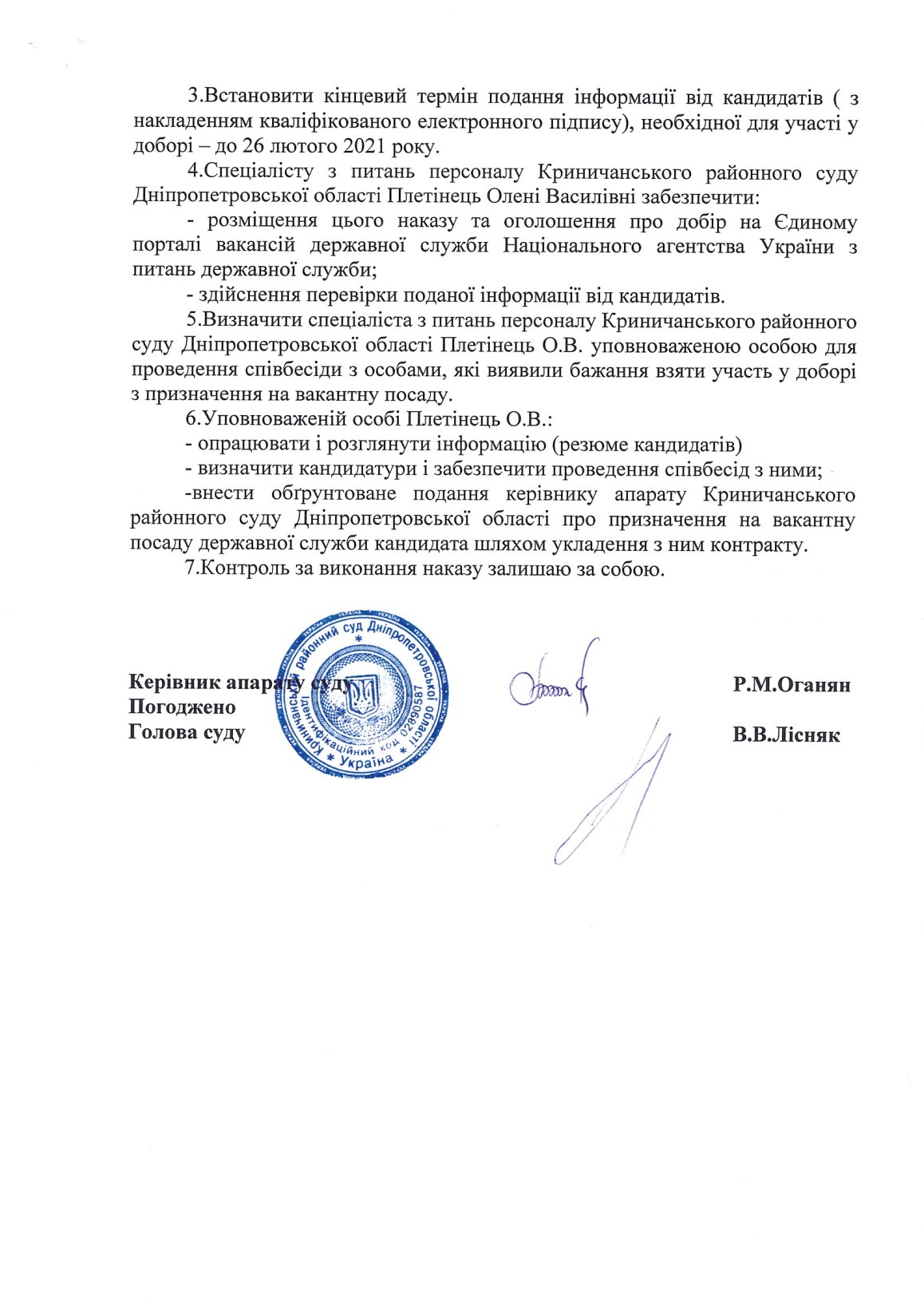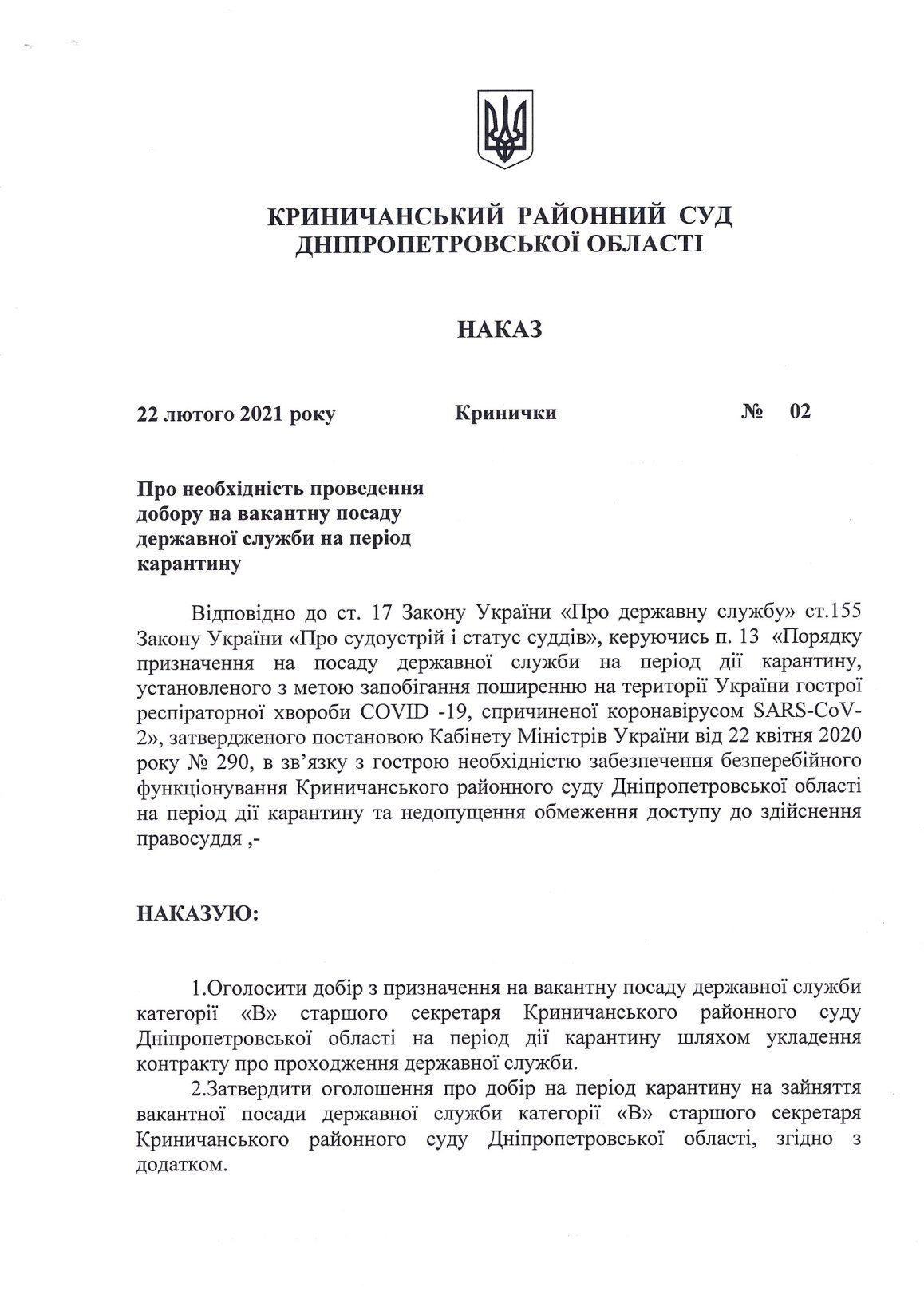 Наказ на добір на вакантну посаду Державної служби на період карантину згідно наказу керівника апарату Криничанського районного суду Дніпропетровської області № 02 від 22.02.2021 р