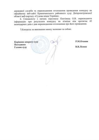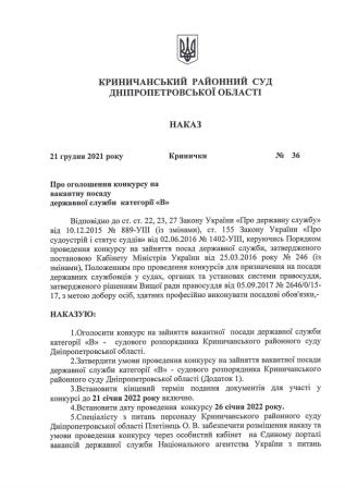 особа, яка бажає взяти участь у конкурсі, подає конкурсній комісії через Єдиний портал вакансій державної служби НАДС таку інформацію: 1) заяву про участь у конкурсі із зазначенням основних мотивів щодо зайняття посади за формою згідно з додатком 2 до Порядку проведення конкурсу на зайняття посад державної служби, затвердженого постановою Кабінету Міністрів України від 25.03.2016 № 246 (із змінами та доповненнями); 2) резюме за формою згідно з додатком 21 до Порядку проведення конкурсу на зайняття посад державної служби; 3) заяву, в якій повідомляє, що до неї не застосовуються заборони, визначені частиною третьою або четвертою статті 1 Закону України «Про очищення влади», та надає згоду на проходження перевірки та на оприлюднення відомостей стосовно неї відповідно до зазначеного Закону; 4) копію Державного сертифіката про рівень володіння державною мовою (витяг з реєстру Державних сертифікатів про рівень володіння державною мовою), що підтверджує рівень володіння державною мовою, визначений Національною комісією зі стандартів державної мови. Подача додатків до заяви не є обов’язковою. Особа, яка виявила бажання взяти участь у конкурсі, може подавати додаткову інформацію, яка підтверджує відповідність встановленим вимогам, зокрема стосовно попередніх результатів тестування, досвіду роботи, професійних компетентностей, репутації (характеристики, рекомендації, наукові публікації тощо). Державні службовці Криничанського районного суду Дніпропетровської області, які бажають взяти участь у конкурсі, подають лише заяву про участь у конкурсі. На електронні документи, що подаються для участі у конкурсі, накладається кваліфікований електронний підпис кандидата. Документи приймаються до 15 год. 45 хв. 21.01.2022 |