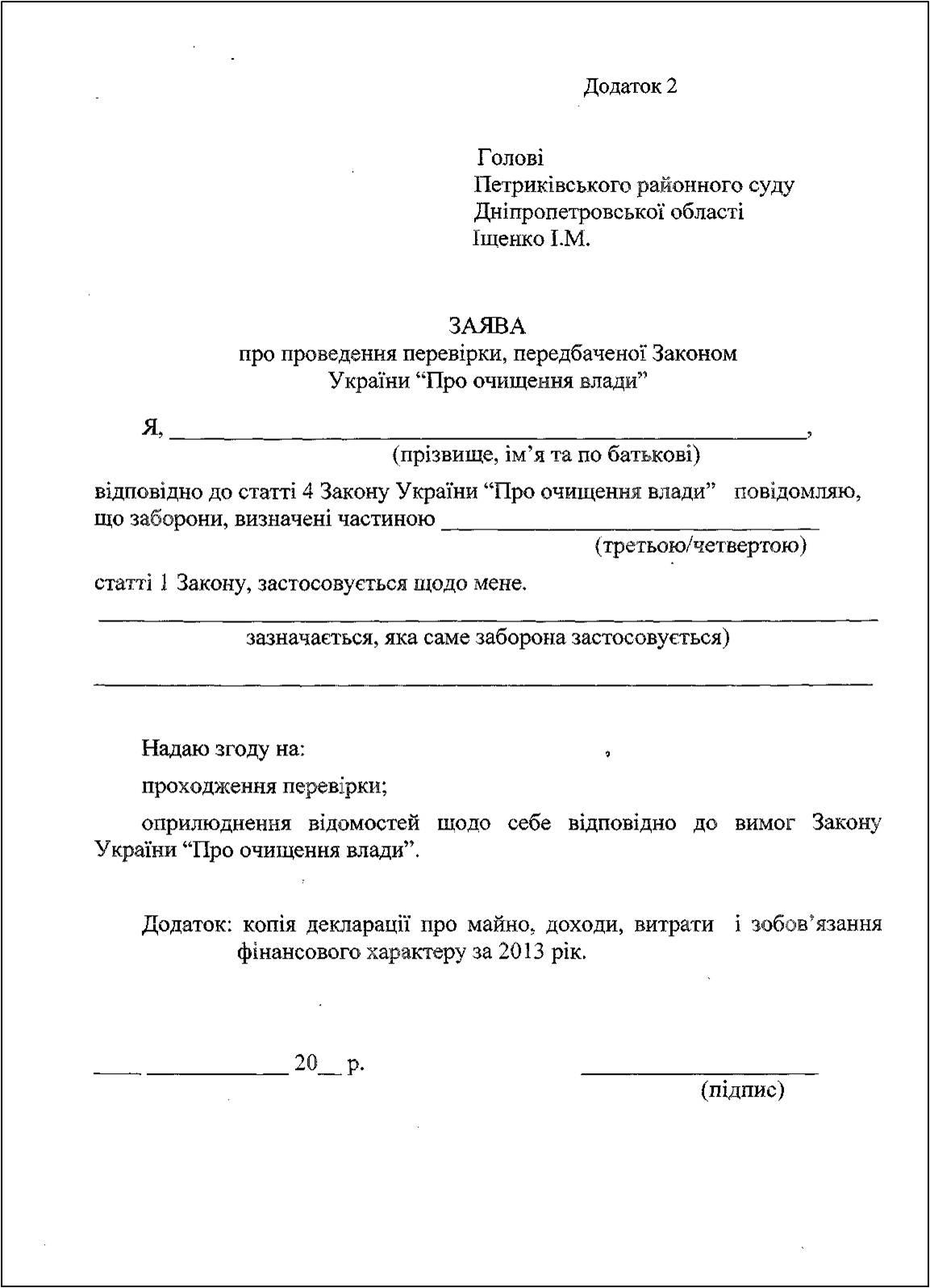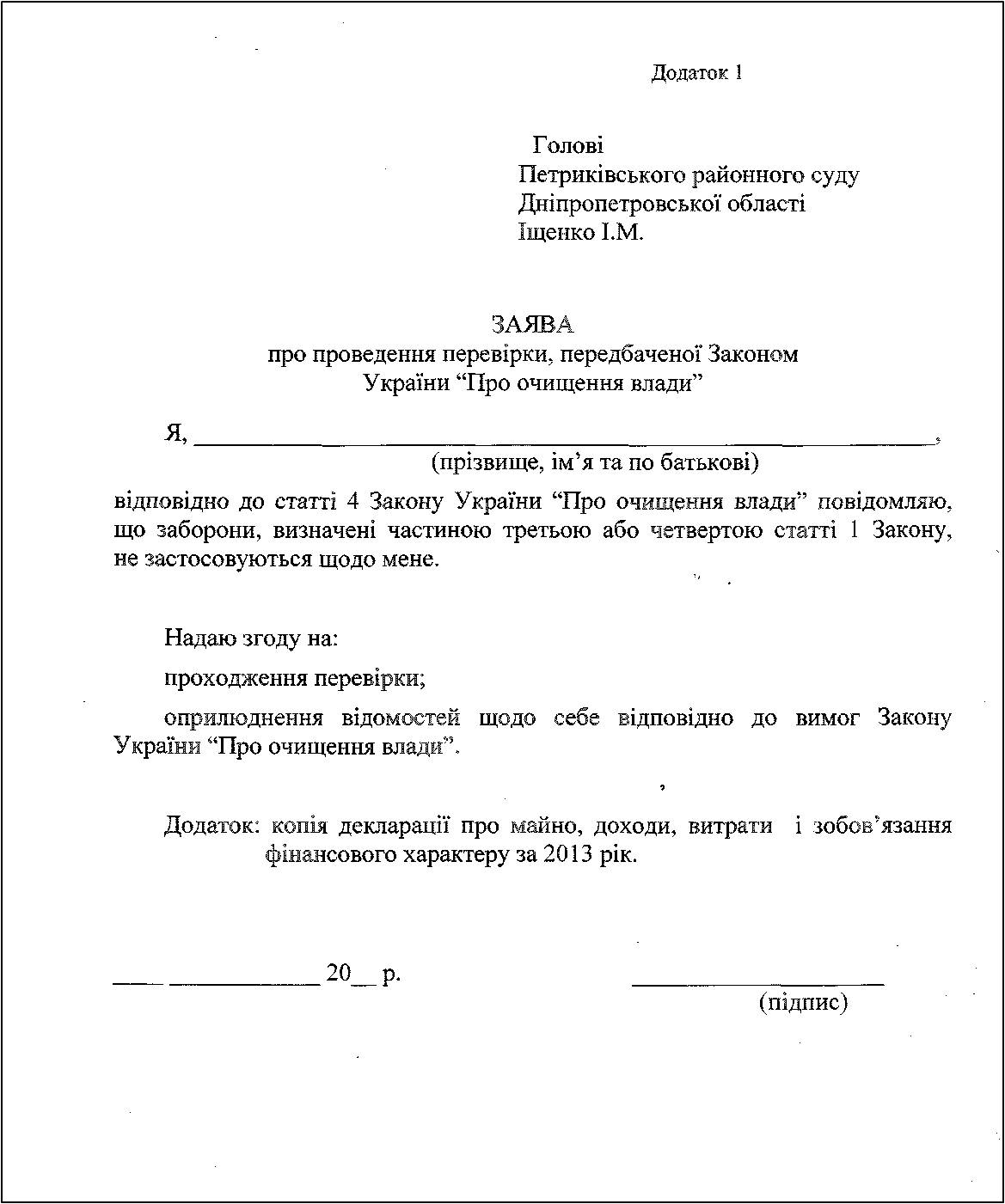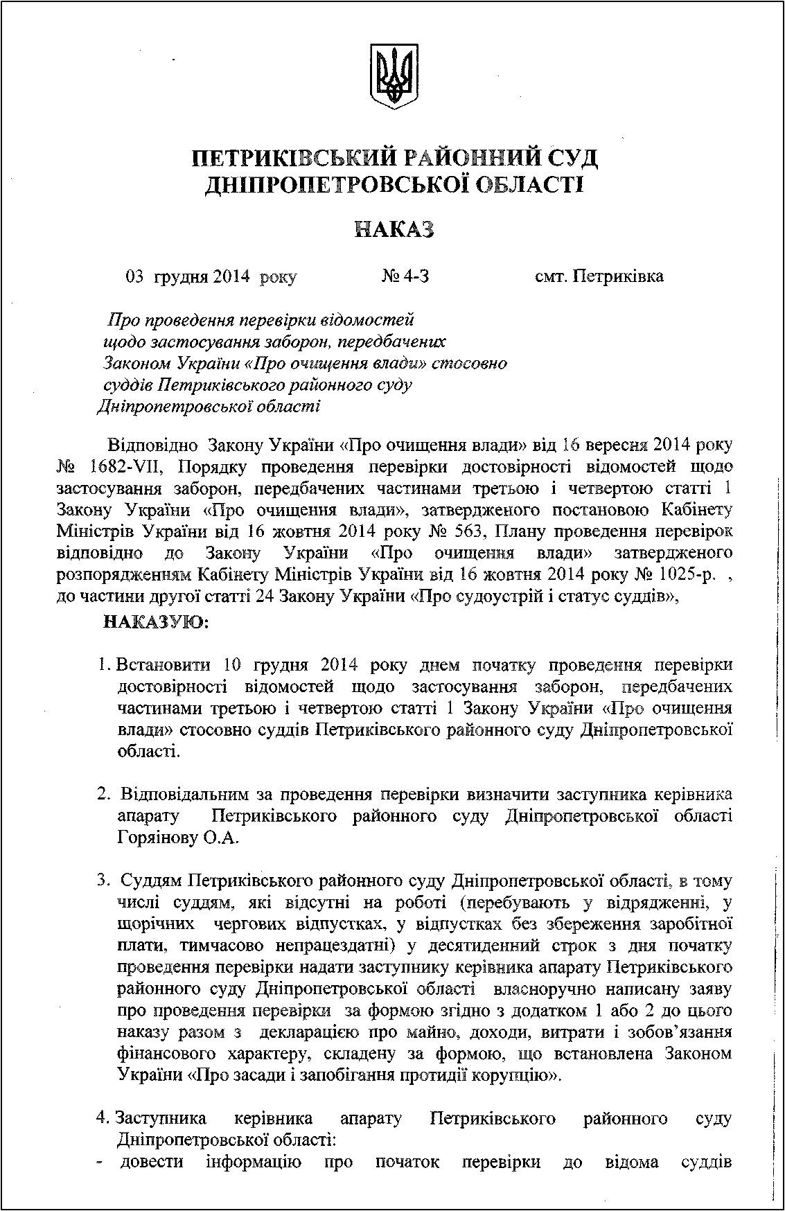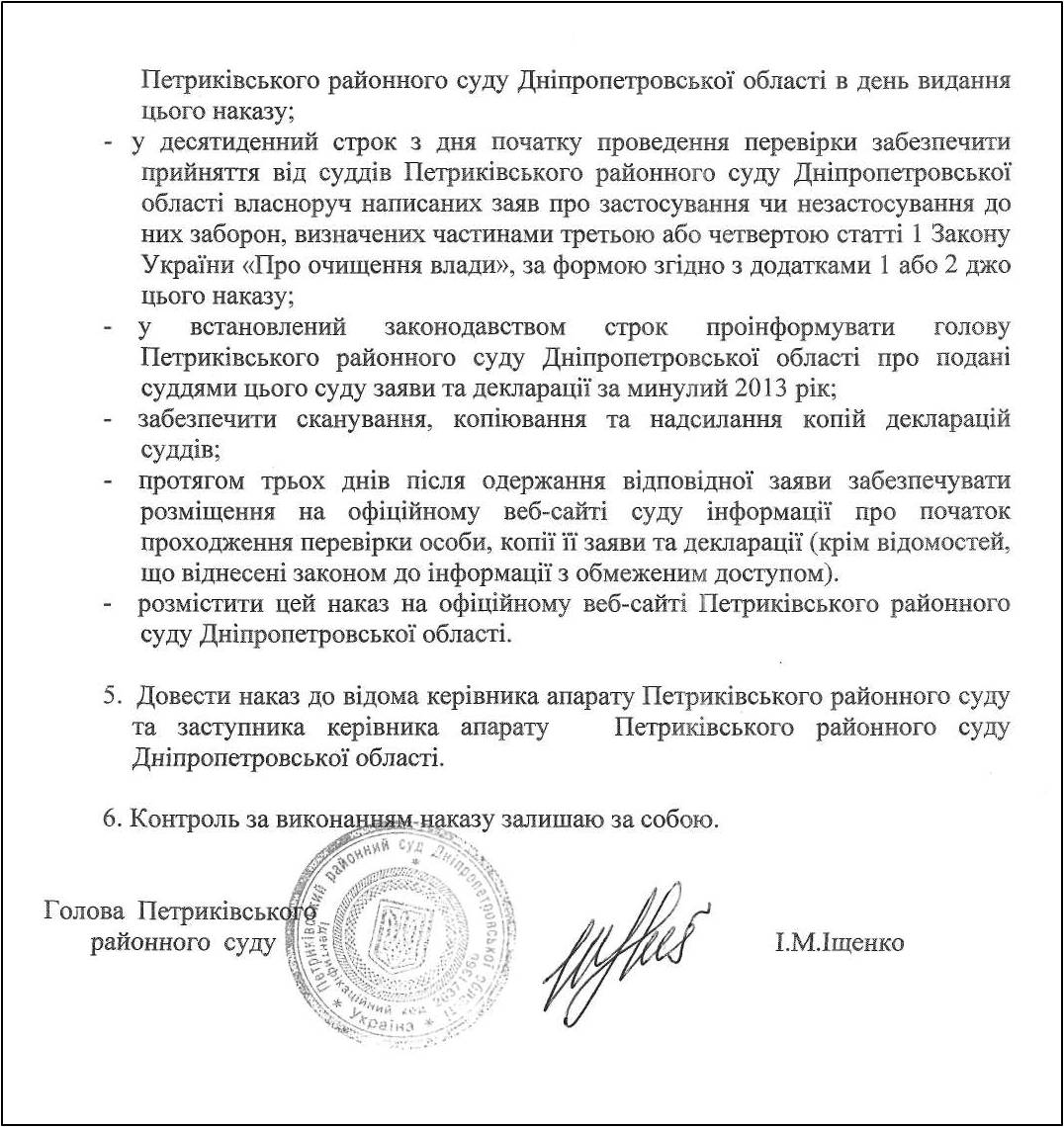 В Петриківському районному суді Дніпропетровської області підписано наказ про проведення перевірки відомостей щодо застосування заборон, передбачених Законом України "Про очищення влади" стосовно суддів Петриківського районного суду