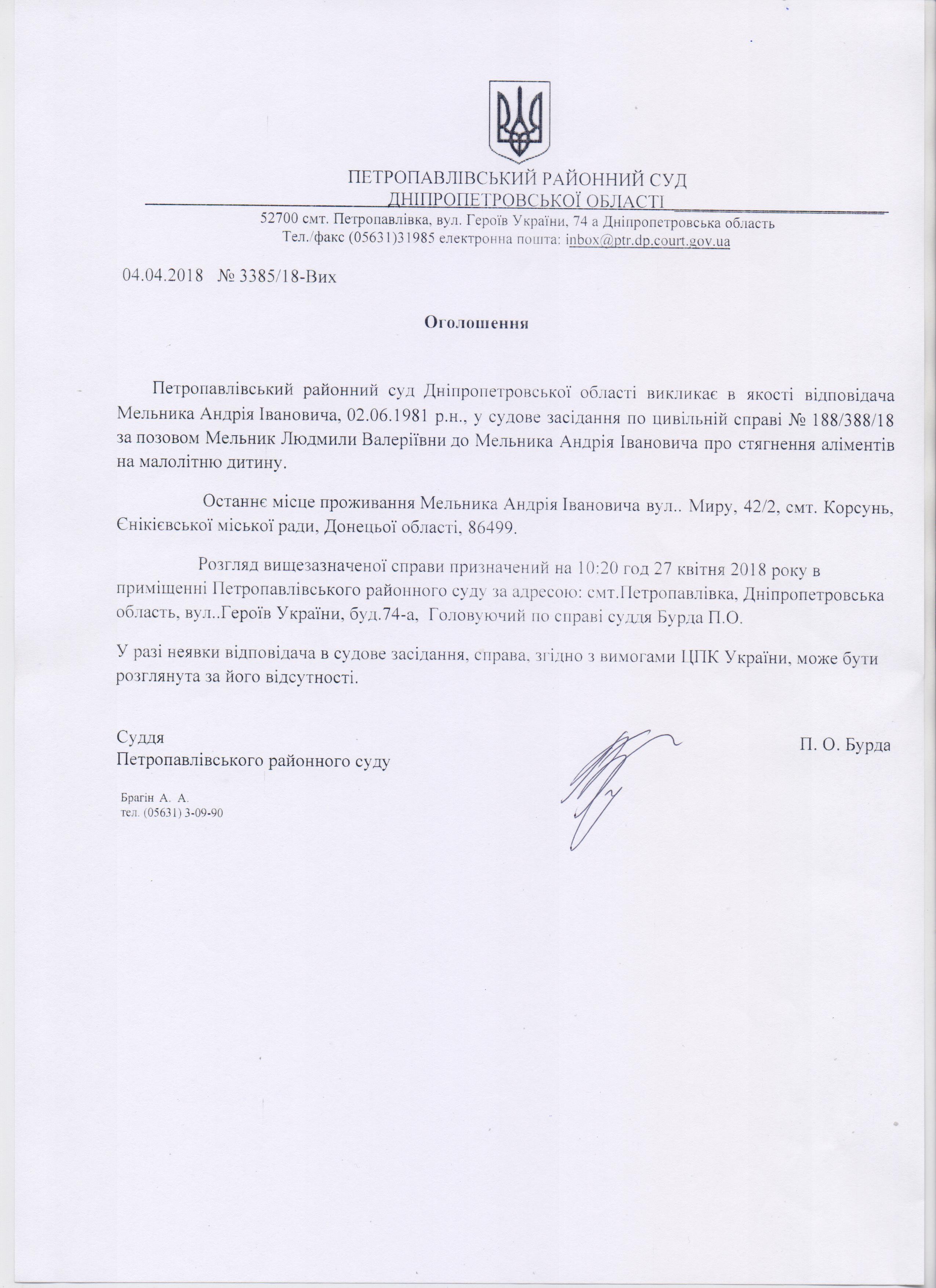 Виклик до суду в якості відповідача Мельника Андрія Івановича по справі № 188/388/18