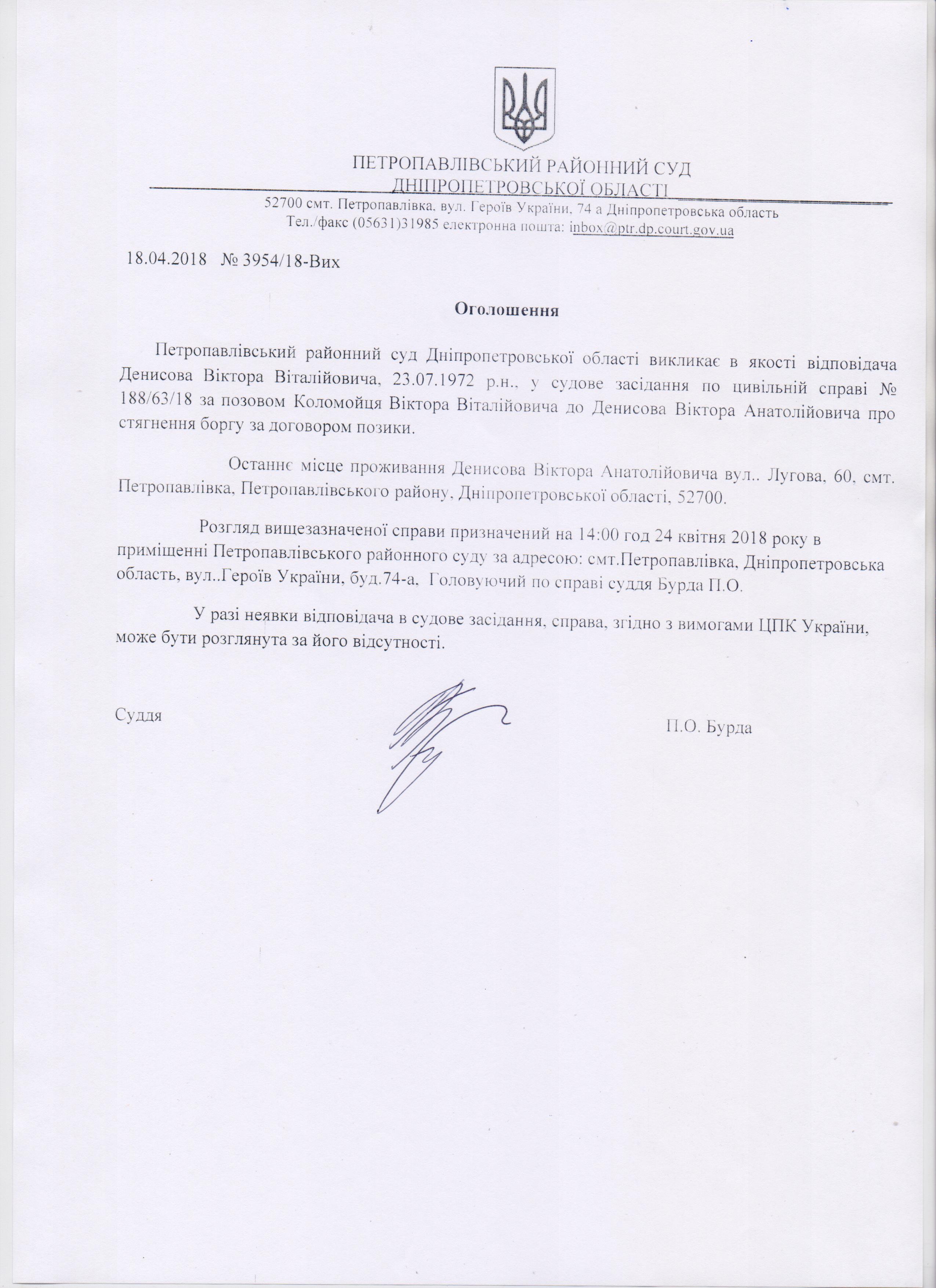 Виклик до суду в якості відповідача Денисова Вітора Віталійовича по справі № 188/63/18