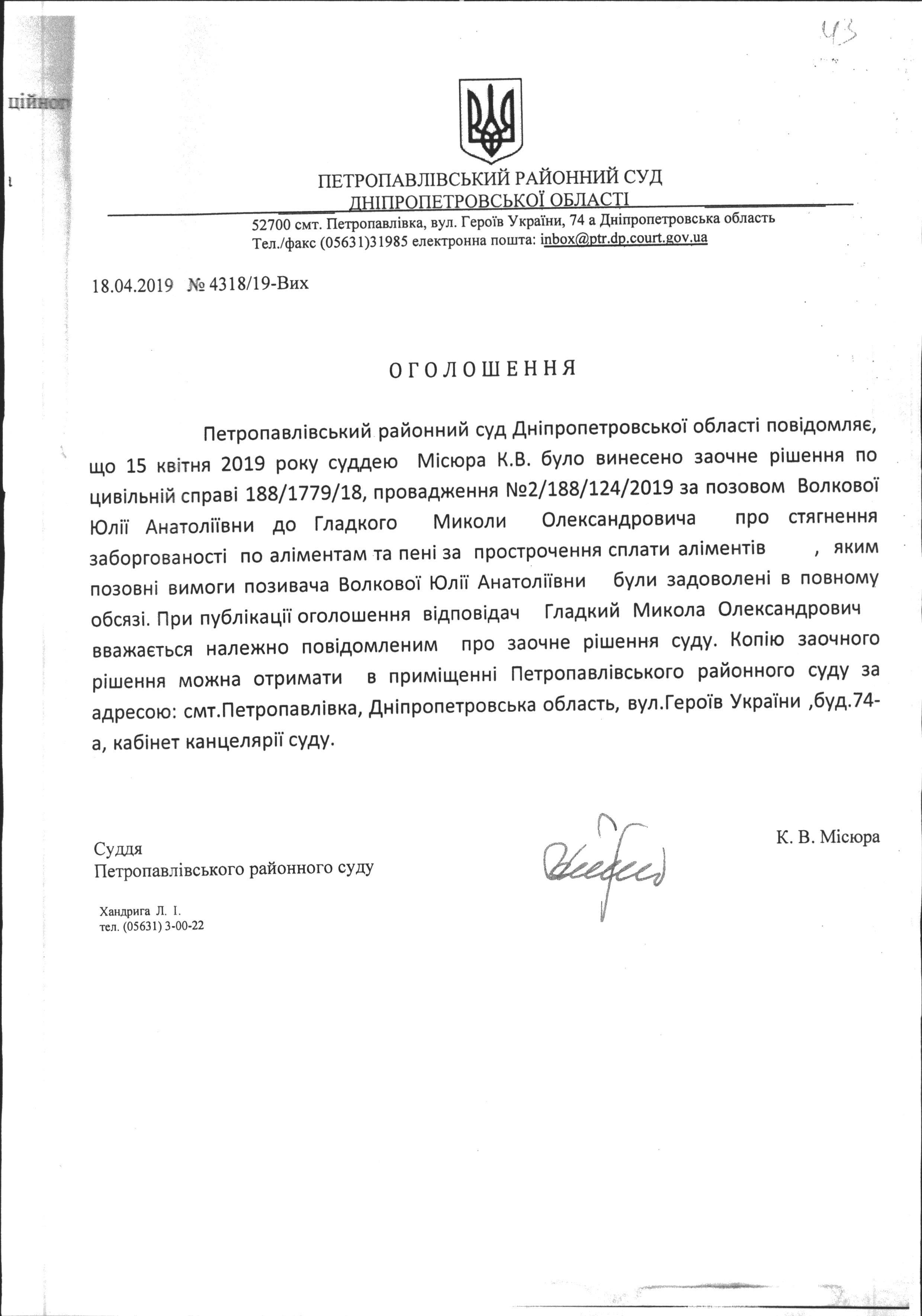 Винесено заочне рішення по цивільній справі № 188/1779/18 за позовом Волкової Юлії Анатоліївни до Гладкого Миколи Олександровича про стягнення заборгованості по аліментам та пені за прострочення сплати аліментів