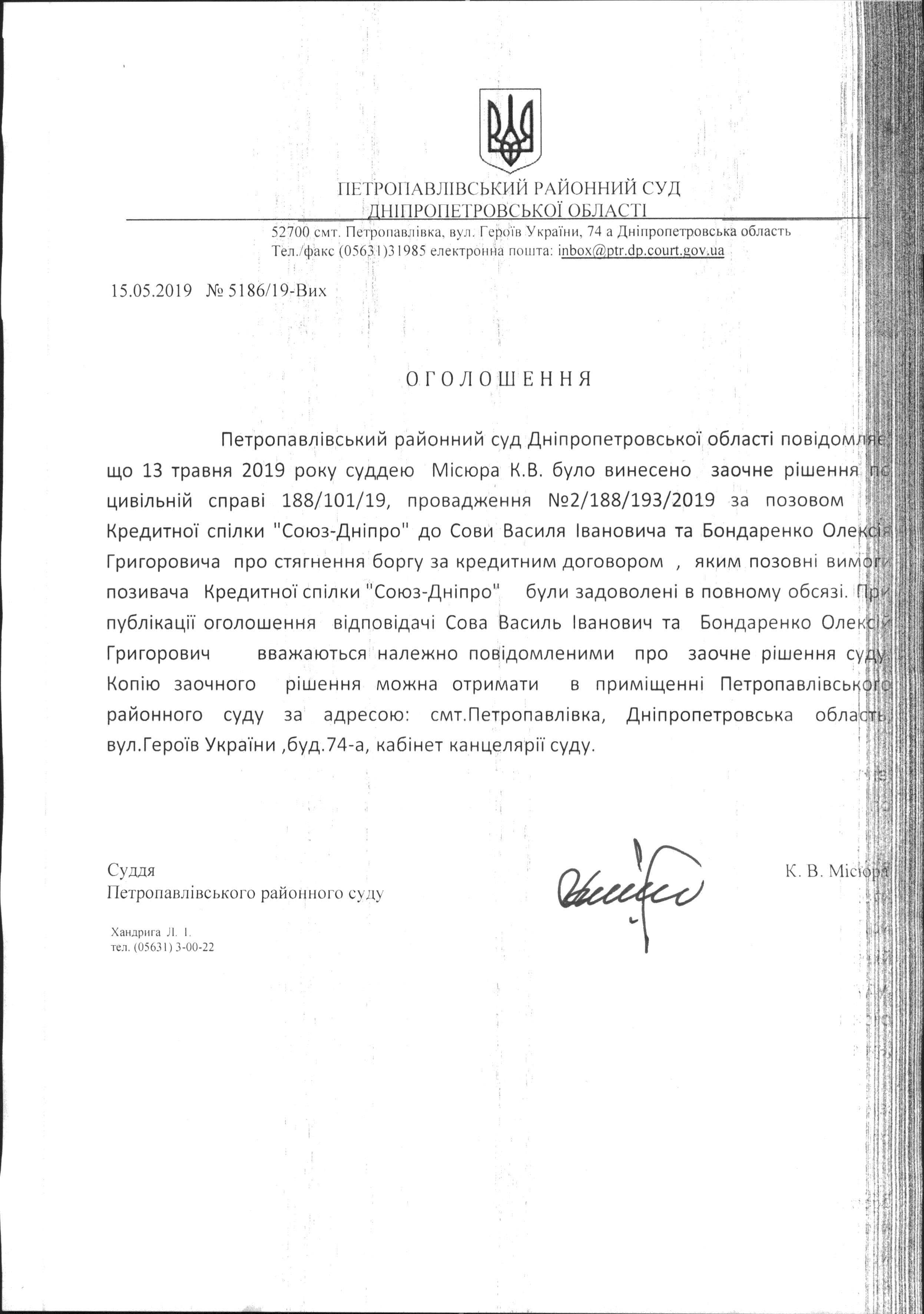 Винесено заочне рішення по цивільній справі № 188/101/19 за позовом Кредитної спілки "Союз-Дніпро" до Сови Василя Івановича та Бондаренко Олексія Григоровича про стягнення боргу за кредитним договором