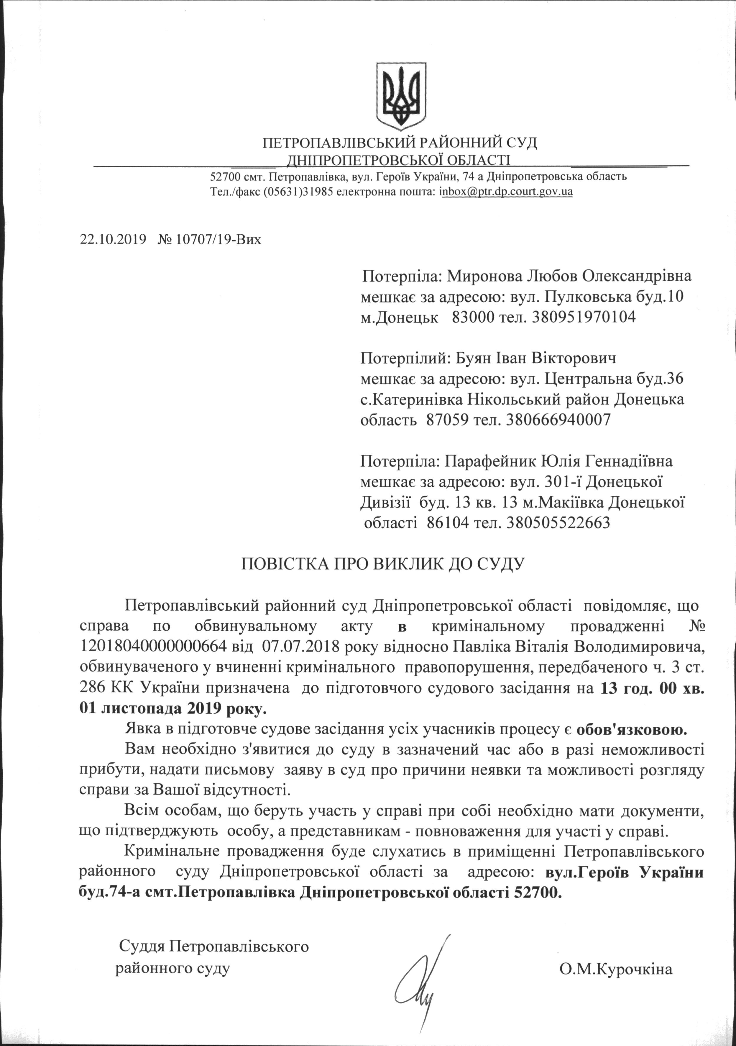 Виклик до суду в якості потерпілих Миронової Л.О., Буяна І.В., Парафейник Ю.Г. у справі по обвинувальному акту в кримінальному провадженні відносно Павліка В.В.