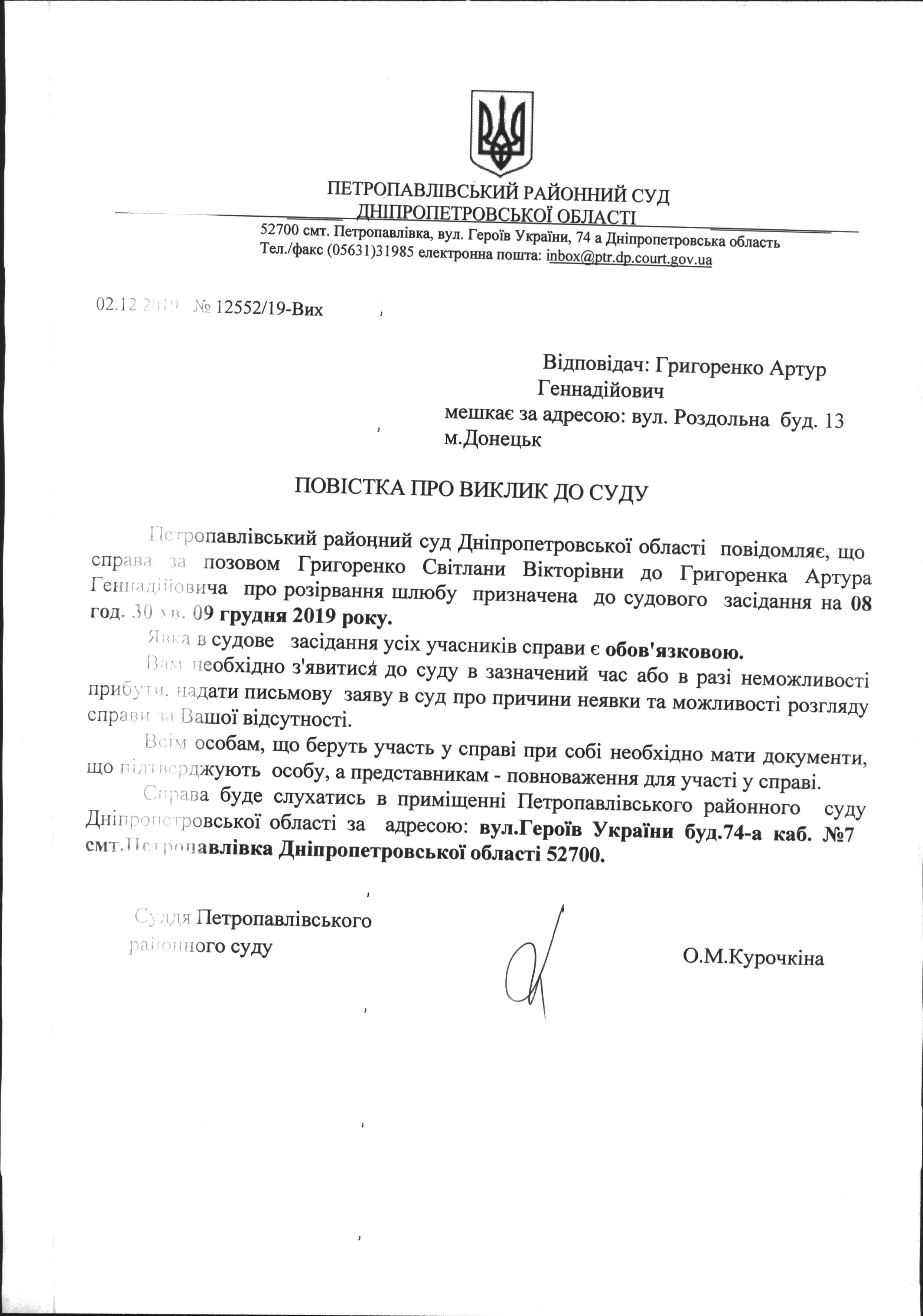 Виклик до суду в якості відповідача Григоренка Артура Геннадійовича по цивільній справі за позовом Григоренко Світлани Вікторівни про розірвання шлюбу