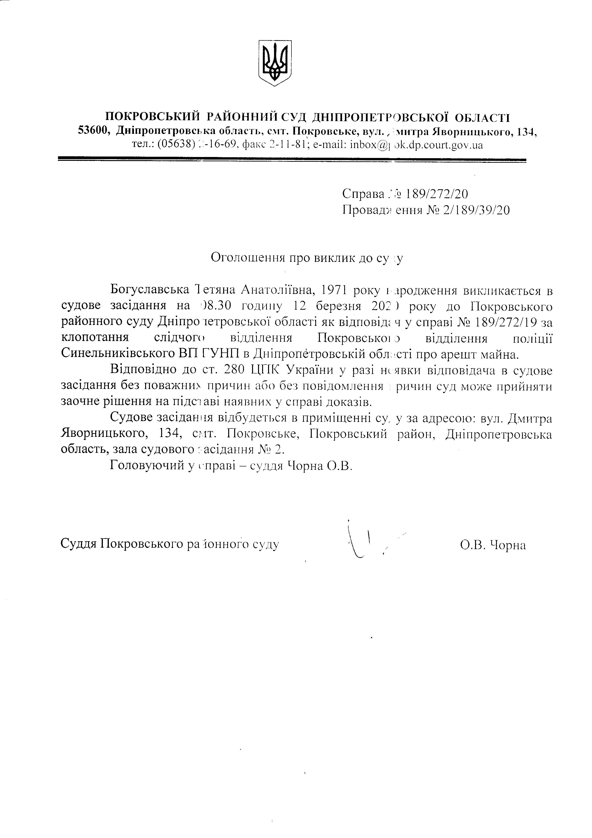Оголошення про виклик до суду Богуславська Тетяна Анатоліївна