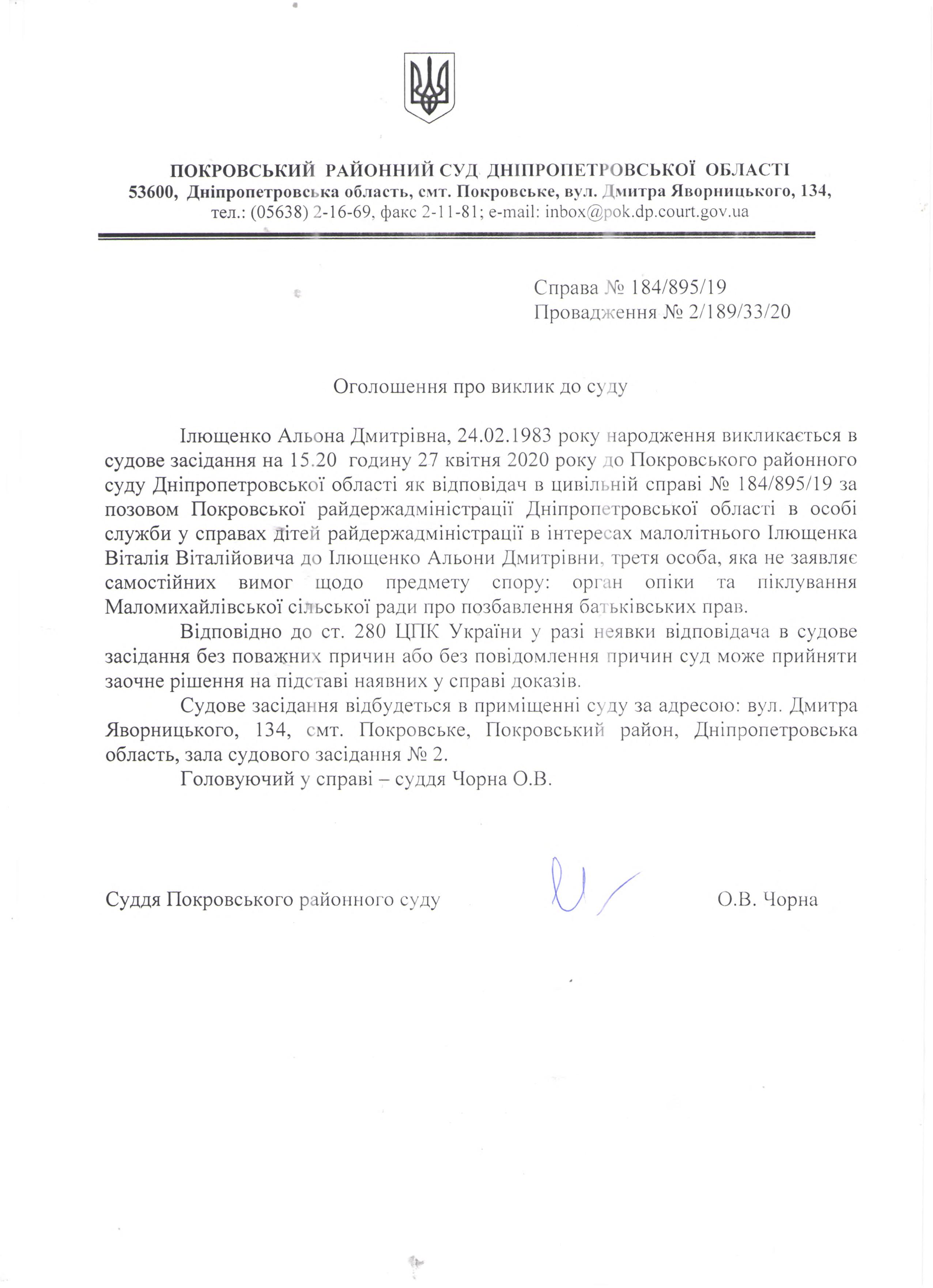 Оголошення про виклик до суду Ілющенко А.Д.