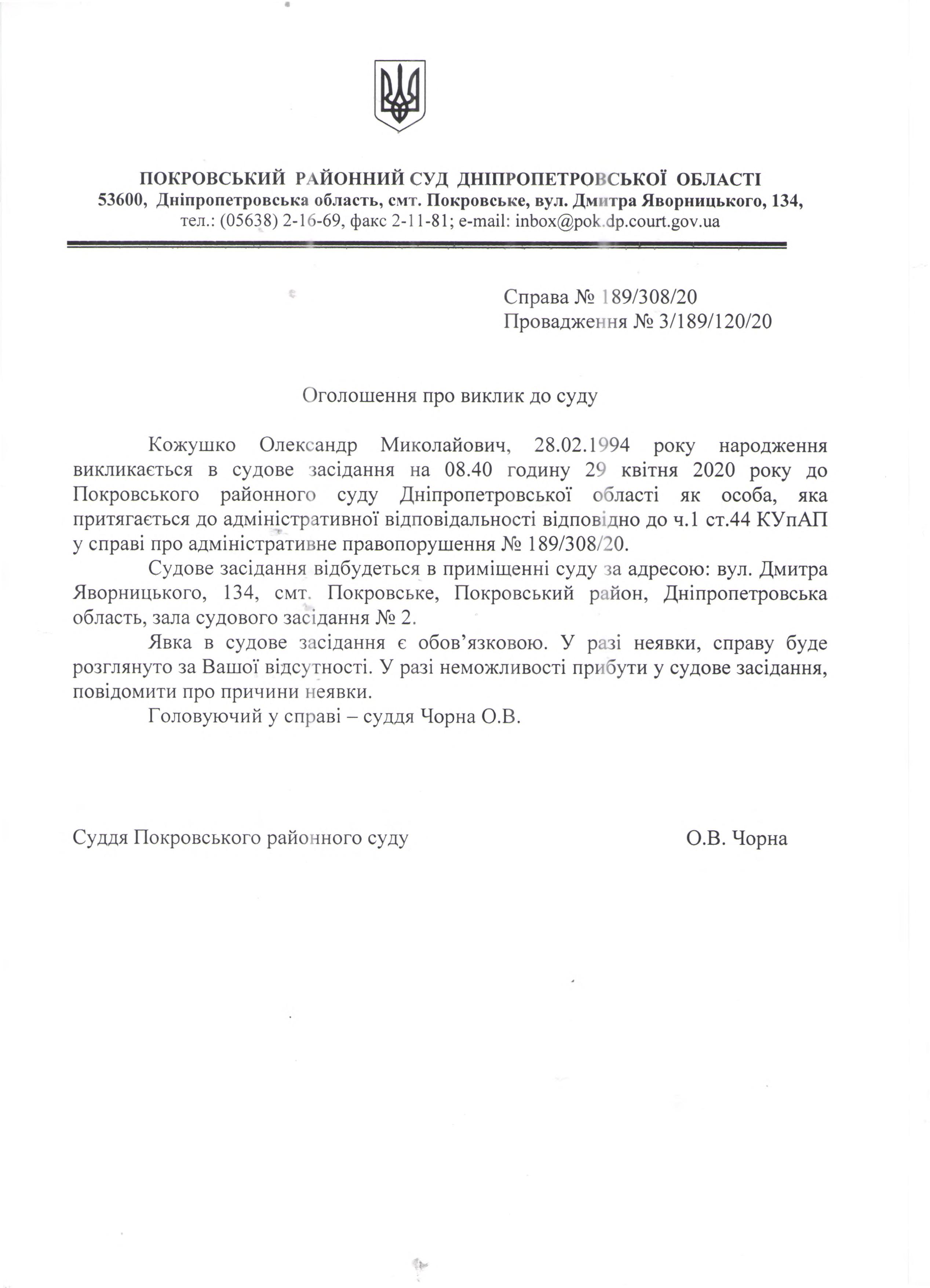 Оголошення про виклик до суду Кожушко О.М..