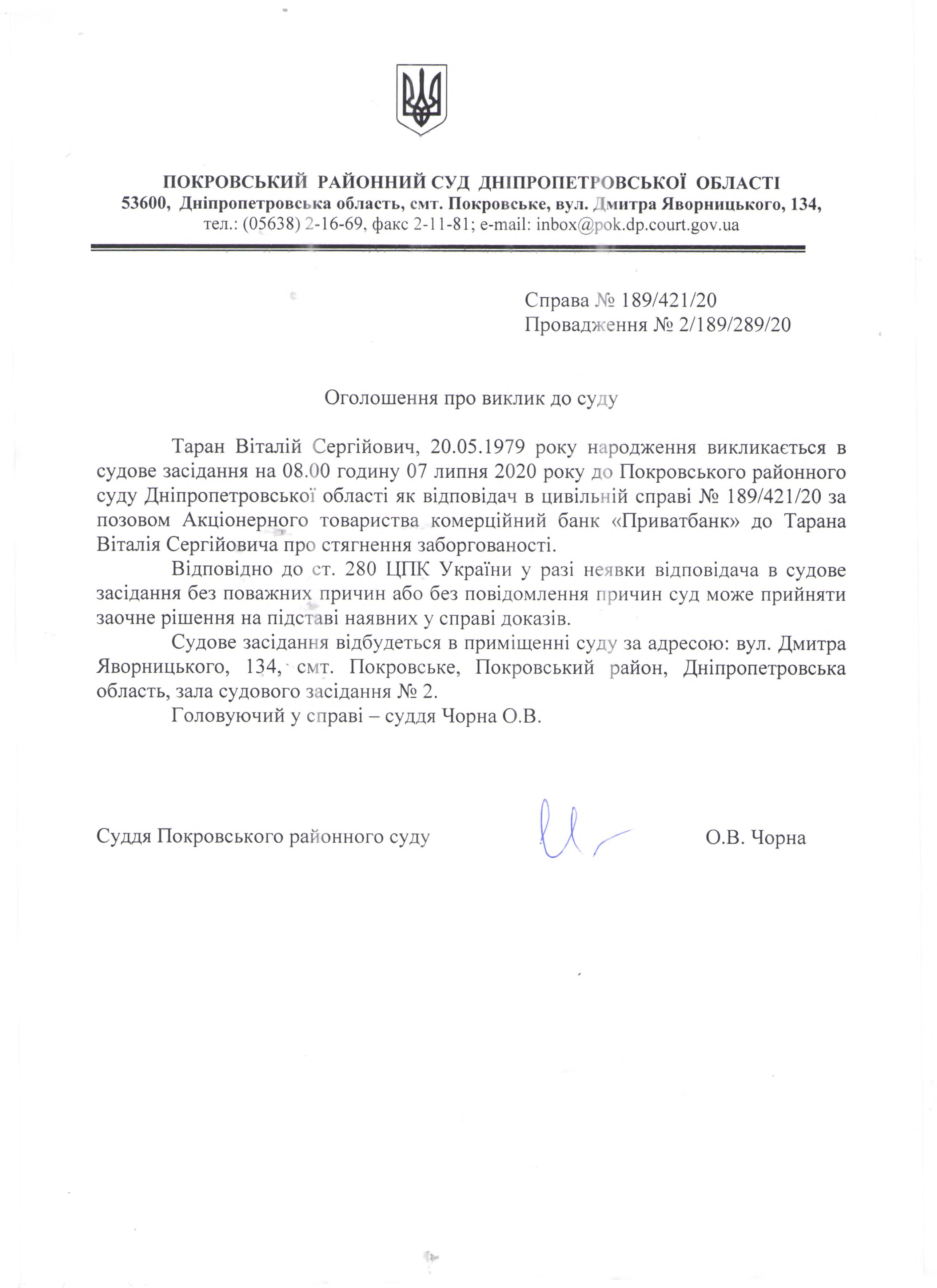 Оголошення про виклик до суду Таран В.С.