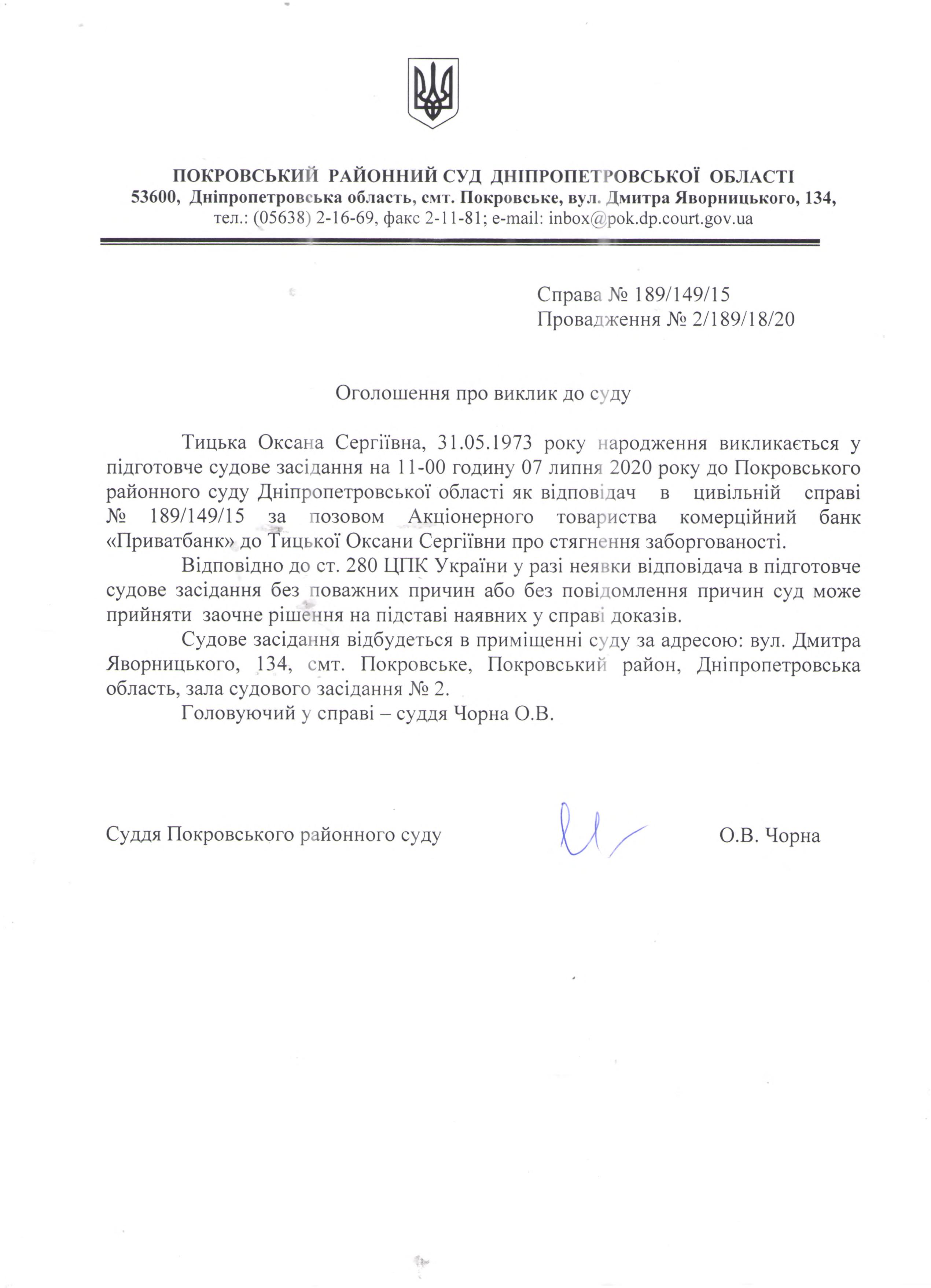 Оголошення про виклик до суду Тицької О.С.