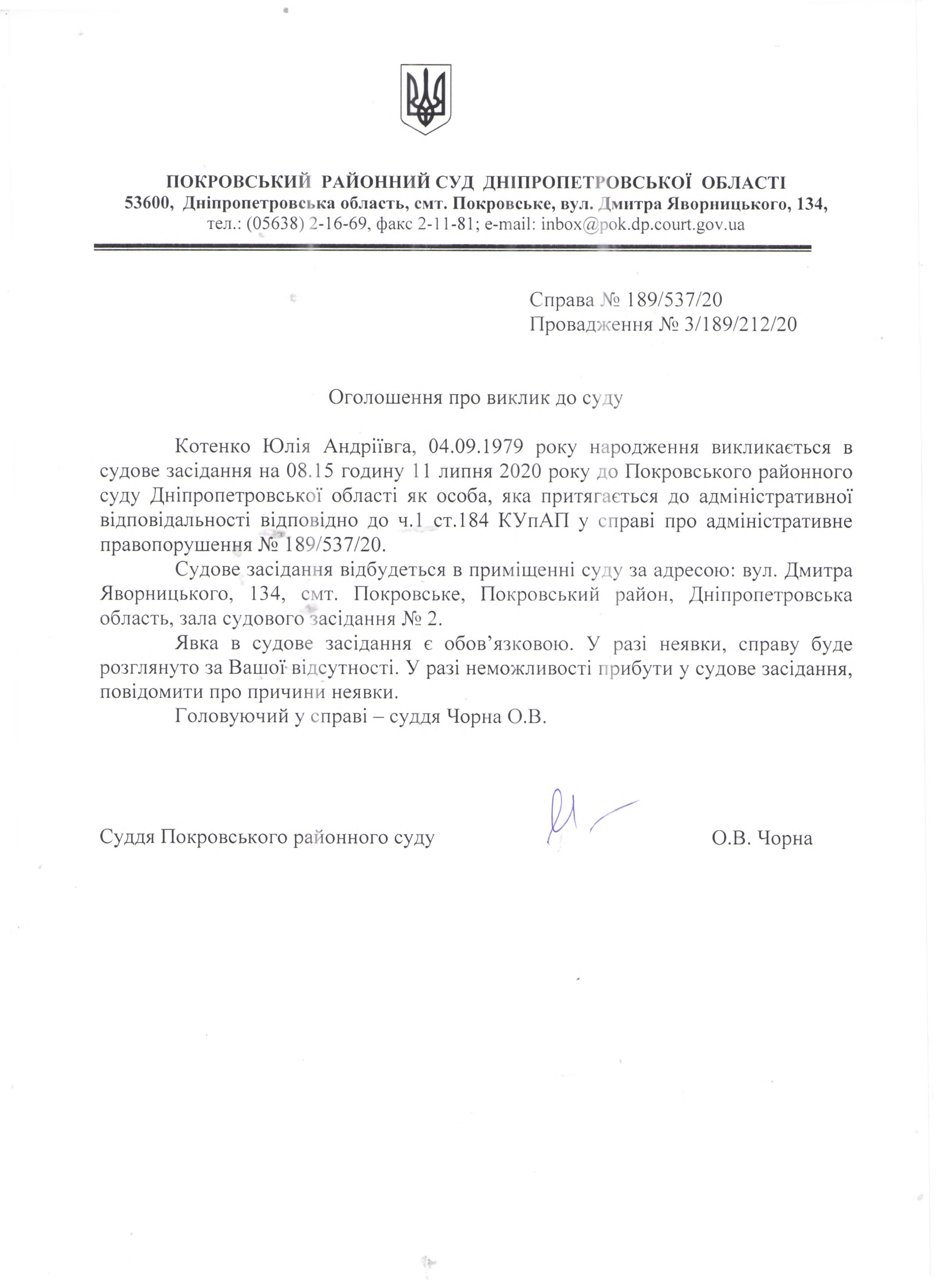 Оголошення про виклик до суду Котенко Ю.А.