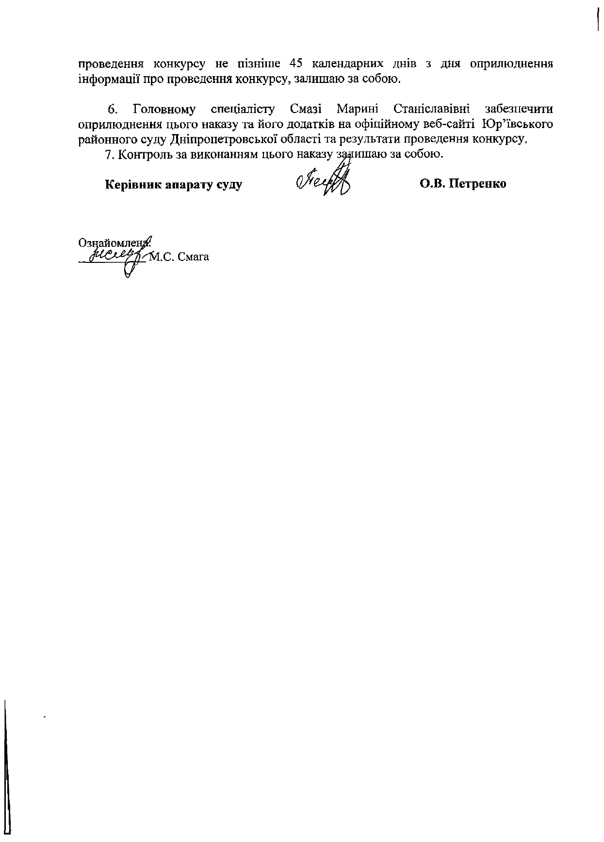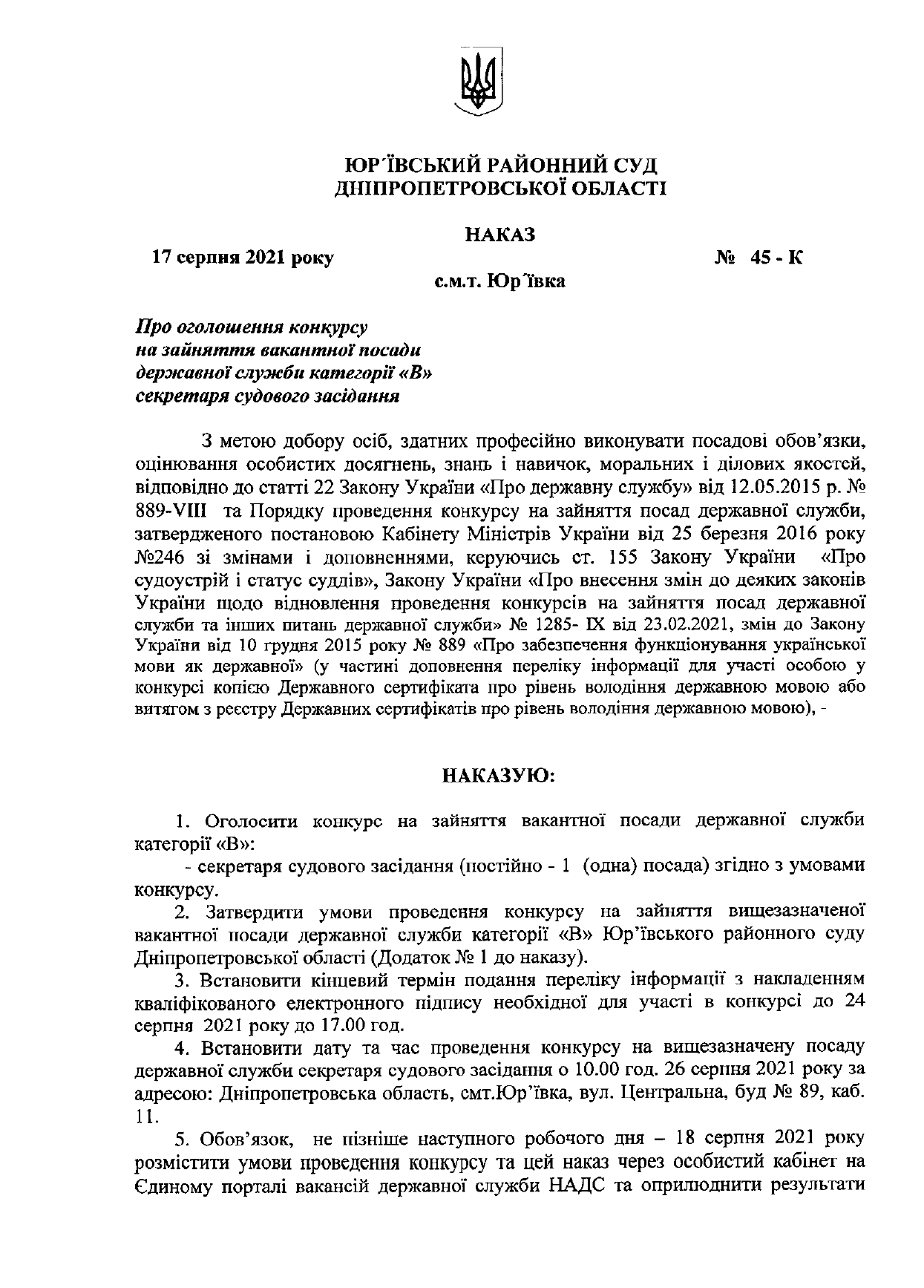 Оголошено конкурс на секретаря судового засідання Юр’ївського районного суду Дніпропетровської області
