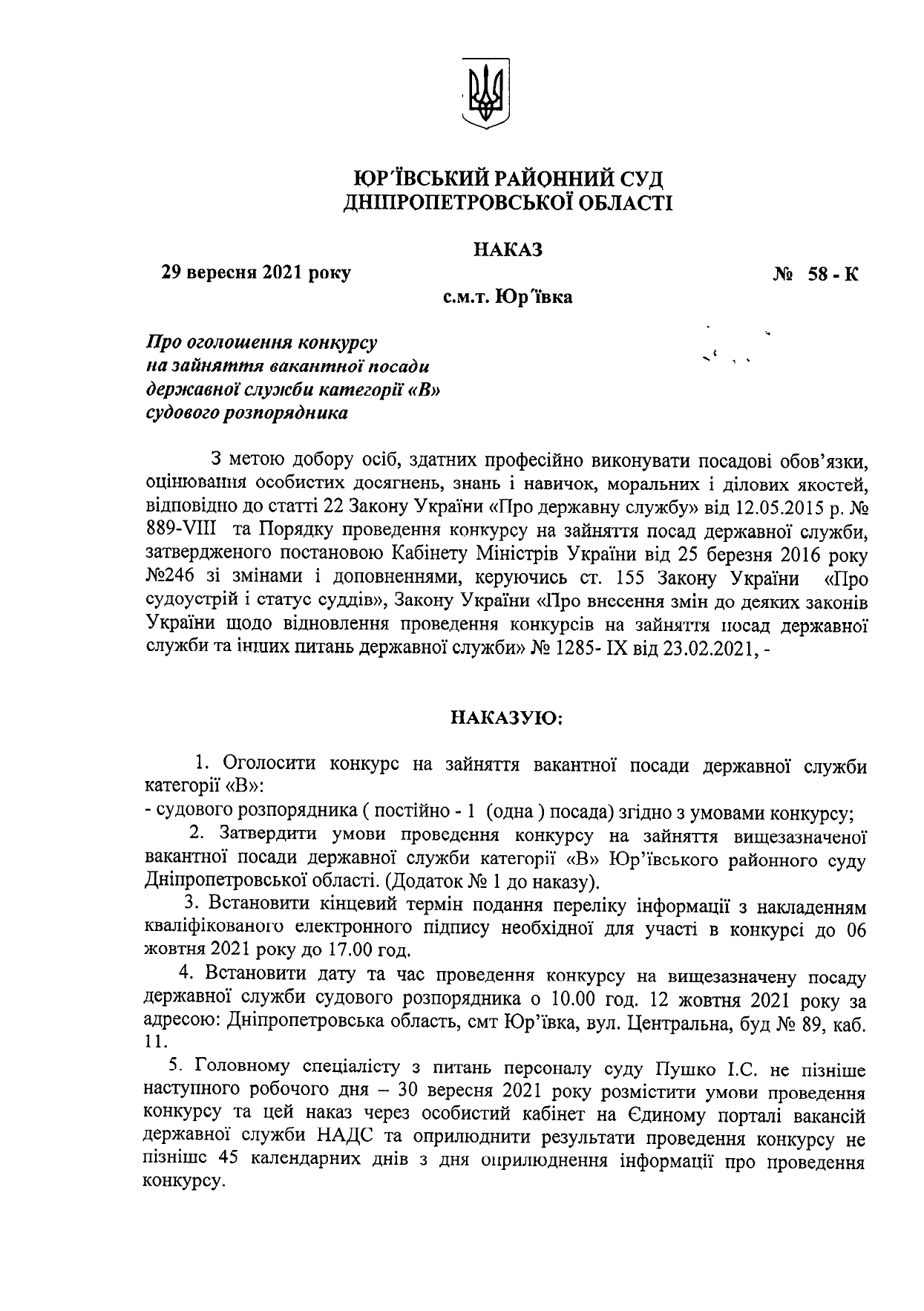 Оголошено конкурс на зайняття вакантної посади судового розпорядника Юр’ївського районного суду Дніпропетровської області