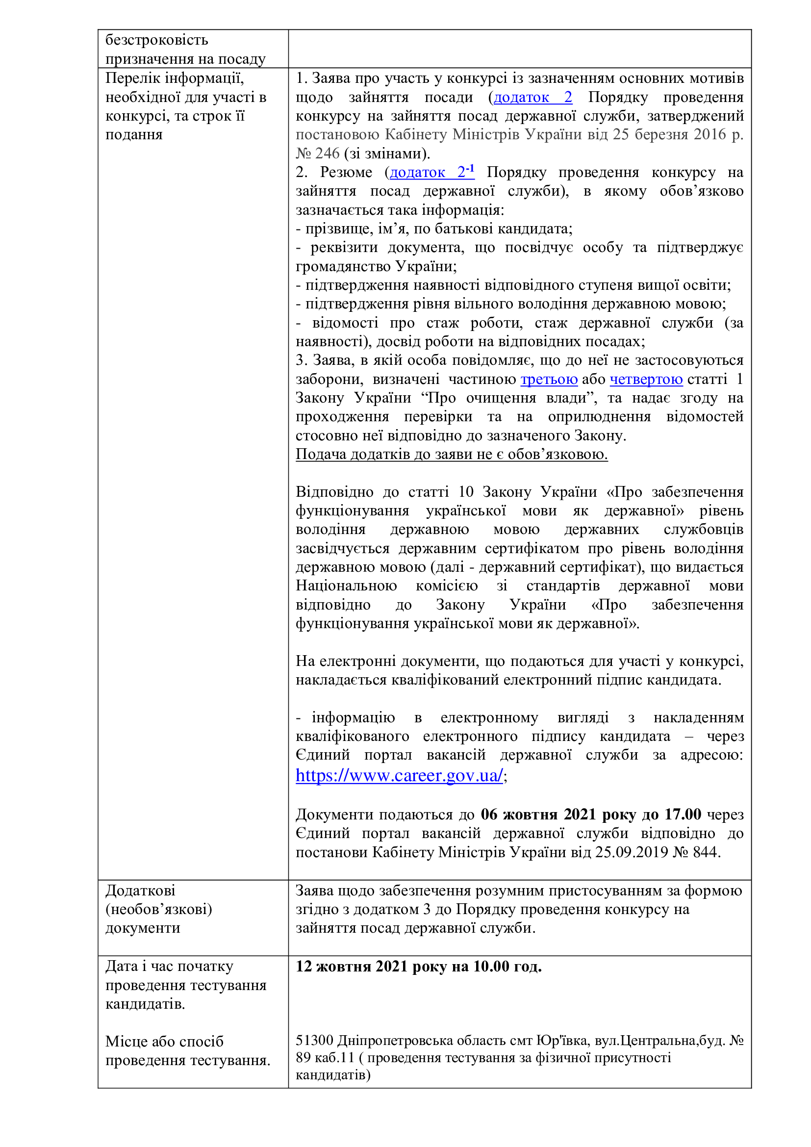 Умови проведення конкурсу на зайняття вакантної посади державної служби категорії «В» - судового розпорядника Юр’ївського районного суду Дніпропетровської області