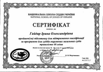 Відповідно до Календарного плану, з метою підвищення рівня кваліфікації на 2019 рік у Дніпропетровському регіональному відділенні Національної школи суддів України, минулого тижня, з 13 по 17 травня 2019 року суддя Юр»ївського районного суду Дніпропетровської області – Гайдар Ірина Олександрівна проходила підготовку за програмою для суддів окружних загальних судів (тривалістю 40 годин) .