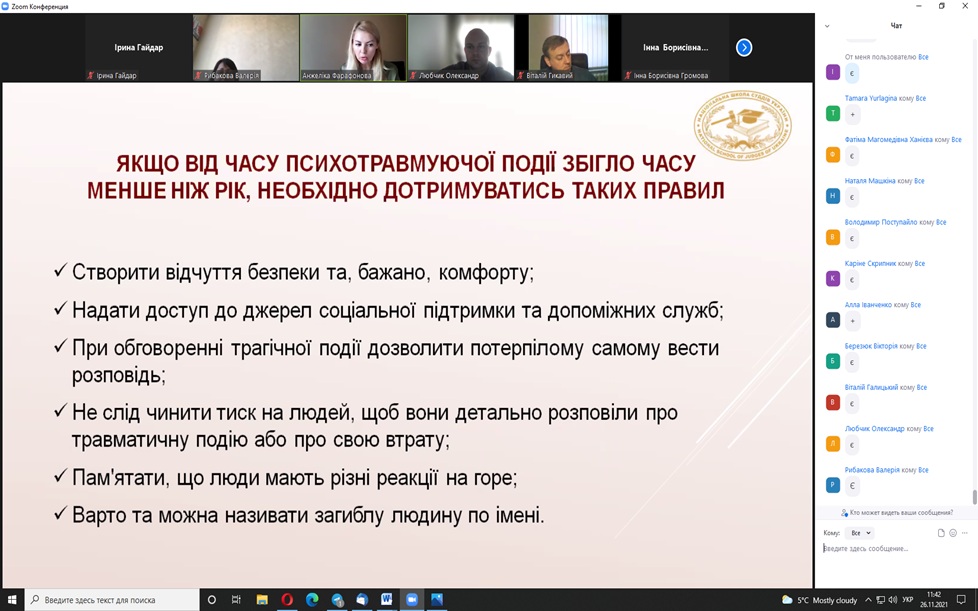 Суддя Гайдар Ірина взяла активну участь у підготовці суддів місцевих загальних судів для підтримання кваліфікації з 22 по 26.11.2021 року, під час якої підвищила рівень теоретичних та практичних знань в різноманітних галузях процесуального та матеріального права, В межах тижневої підготовки пройшла тренінги на теми «Проблемні питання відшкодування шкоди в цивільному судочинстві» та «Пробація у кримінальному судочинстві».