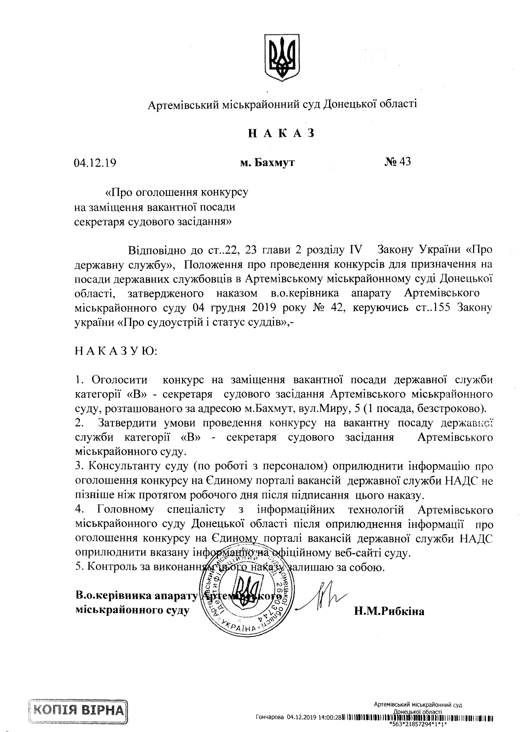 Артемівський міськрайонний суд Донецької області, вул.Миру, 5, м.Бахмут, Донецька область, о 15 годині 30 хвилин 20 грудня 2019 року |