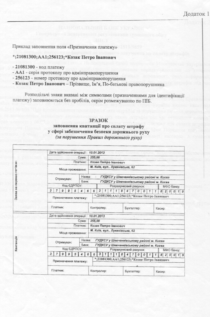 Приклад заповнення поля «Призначення платежу» та зразок заповнення квитанції про сплату штрафу у сфері забезпечення безпеки дорожнього руху: