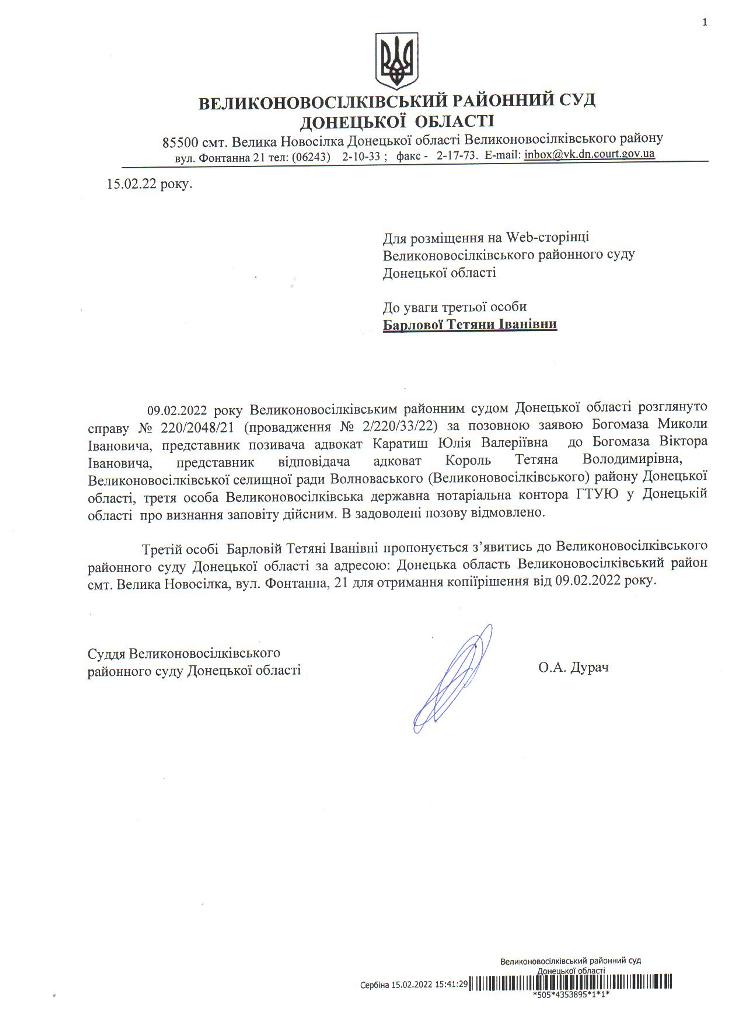 Оголошення для Борлової Т. І. щодо отримання копії рішення