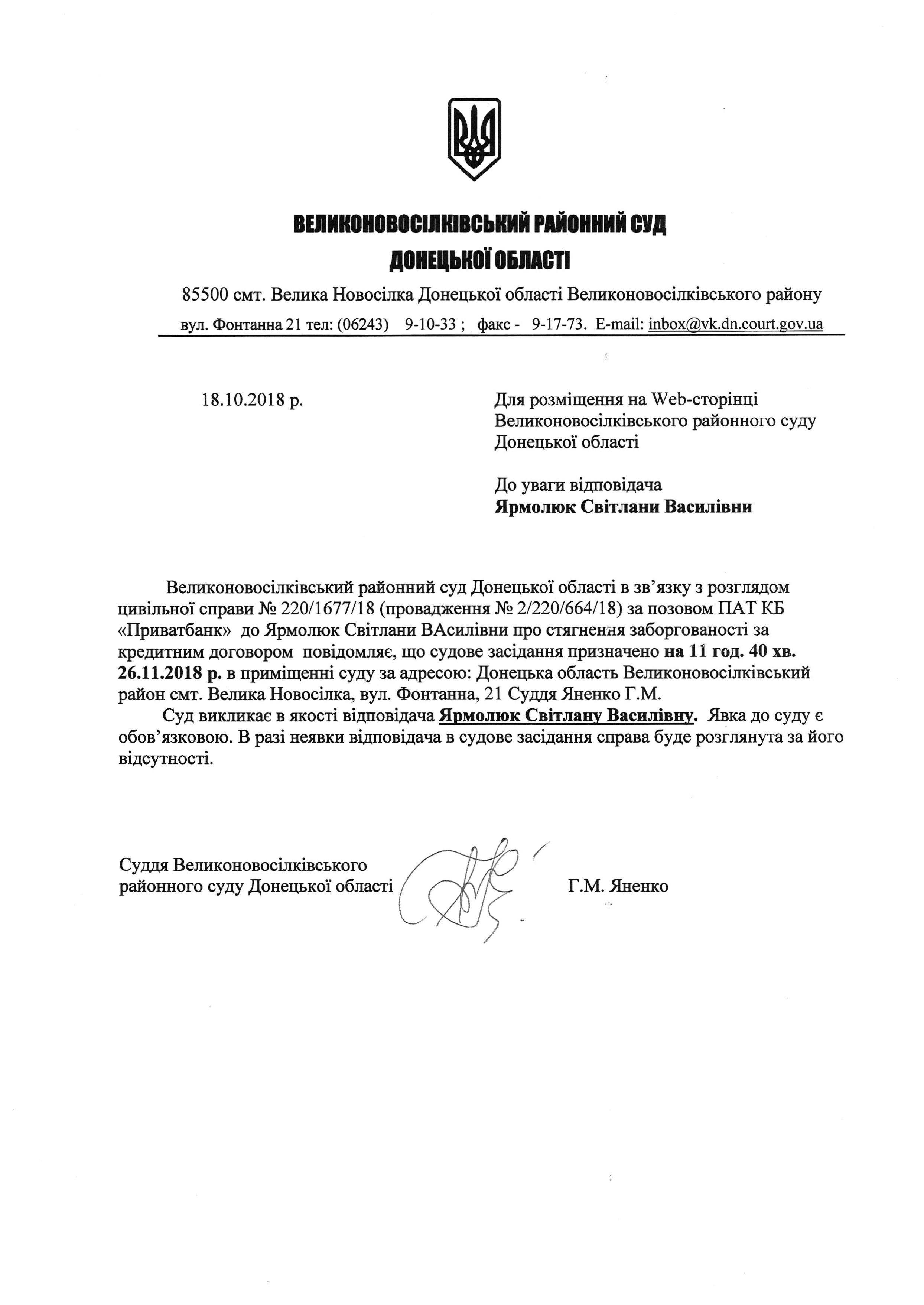 Оголошення про виклик до суду Ярмолюк С.В.