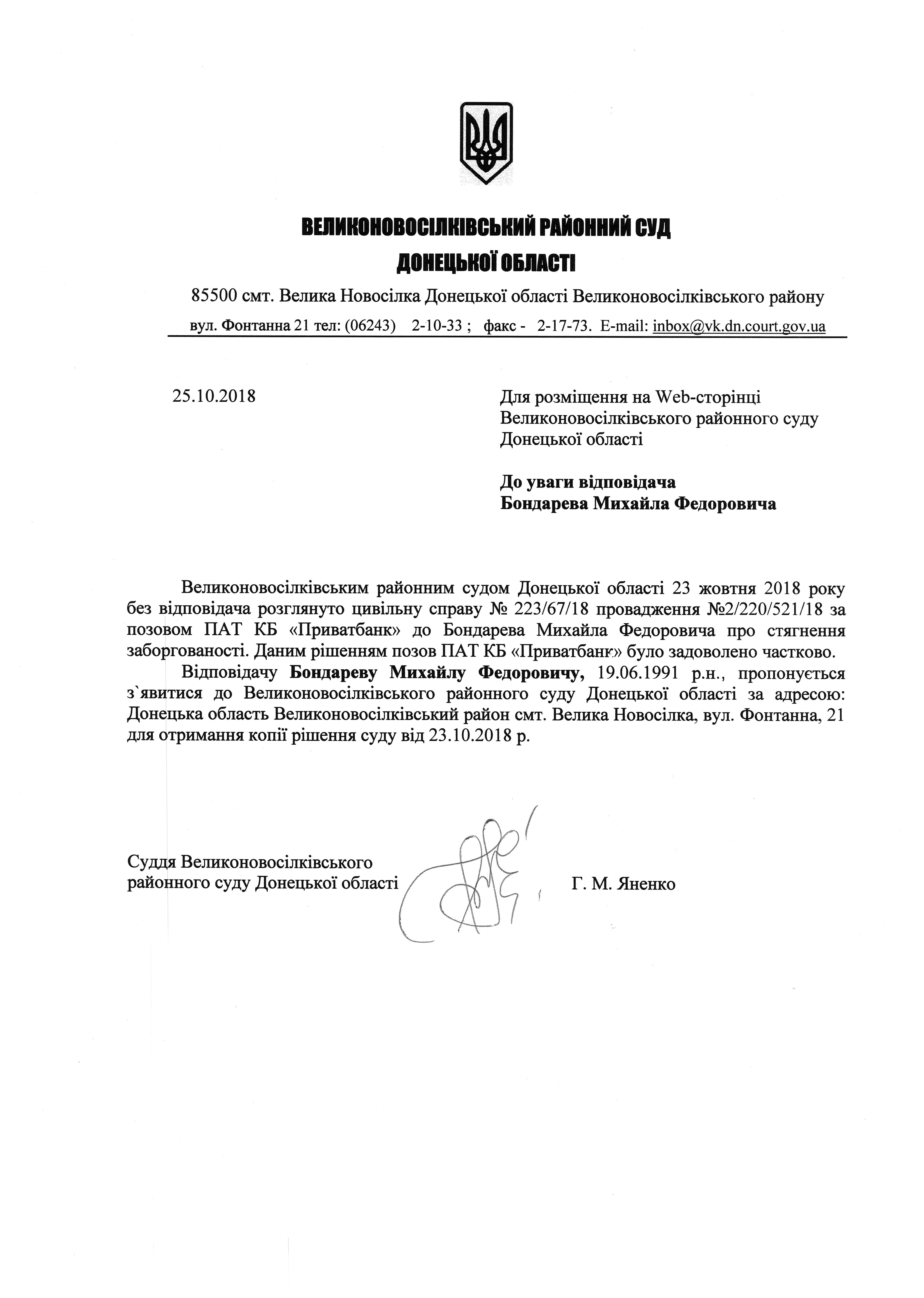 Оголошення про виклик до суду Бондарева М.Ф.