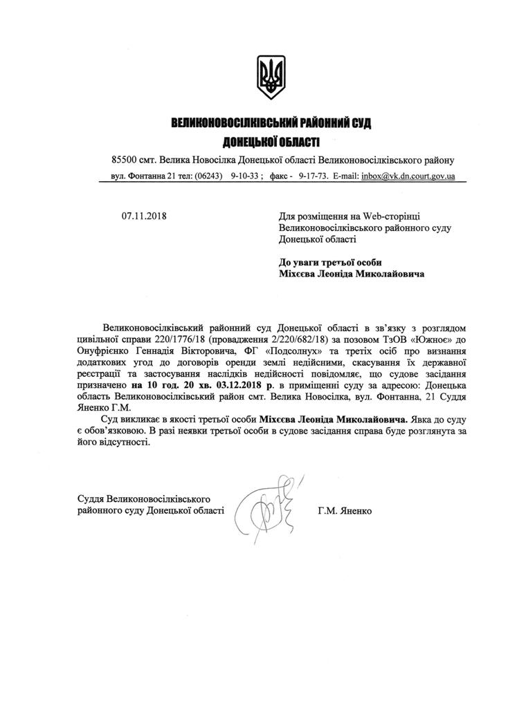 Оголошення про виклик до суду Міхєєва Л.М.