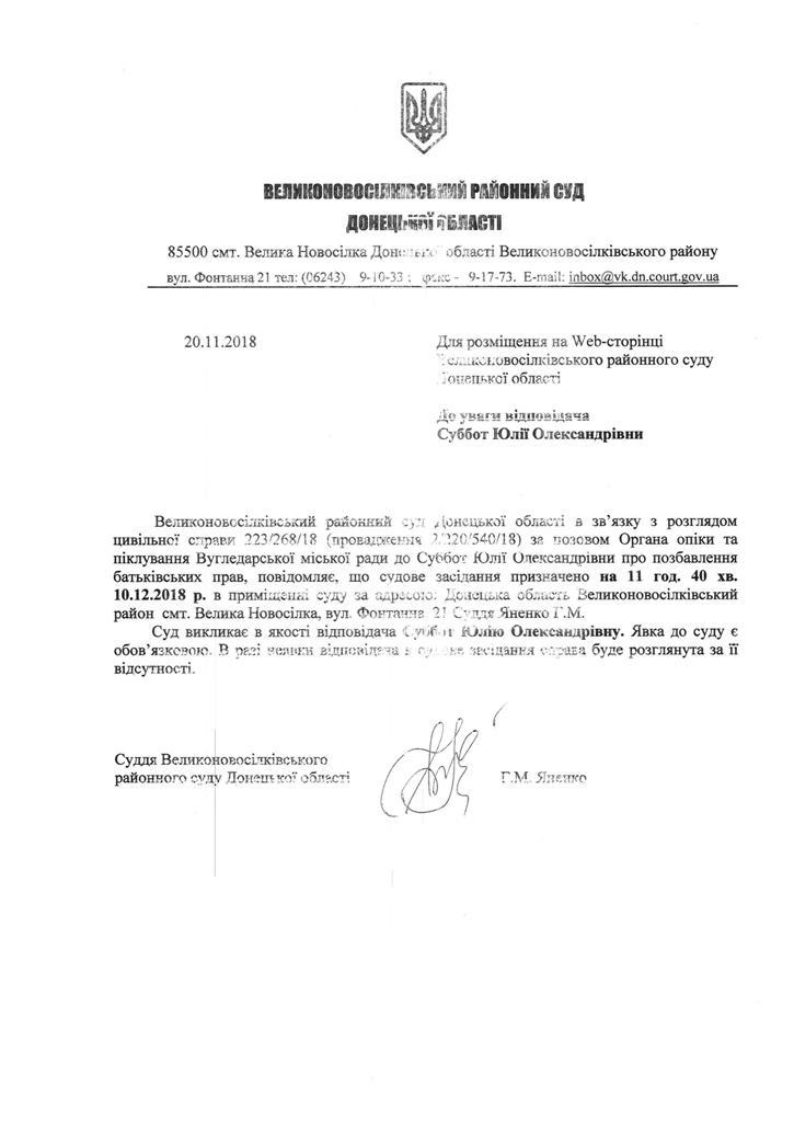 Оголошення про виклик до суду Суббот Ю.О.