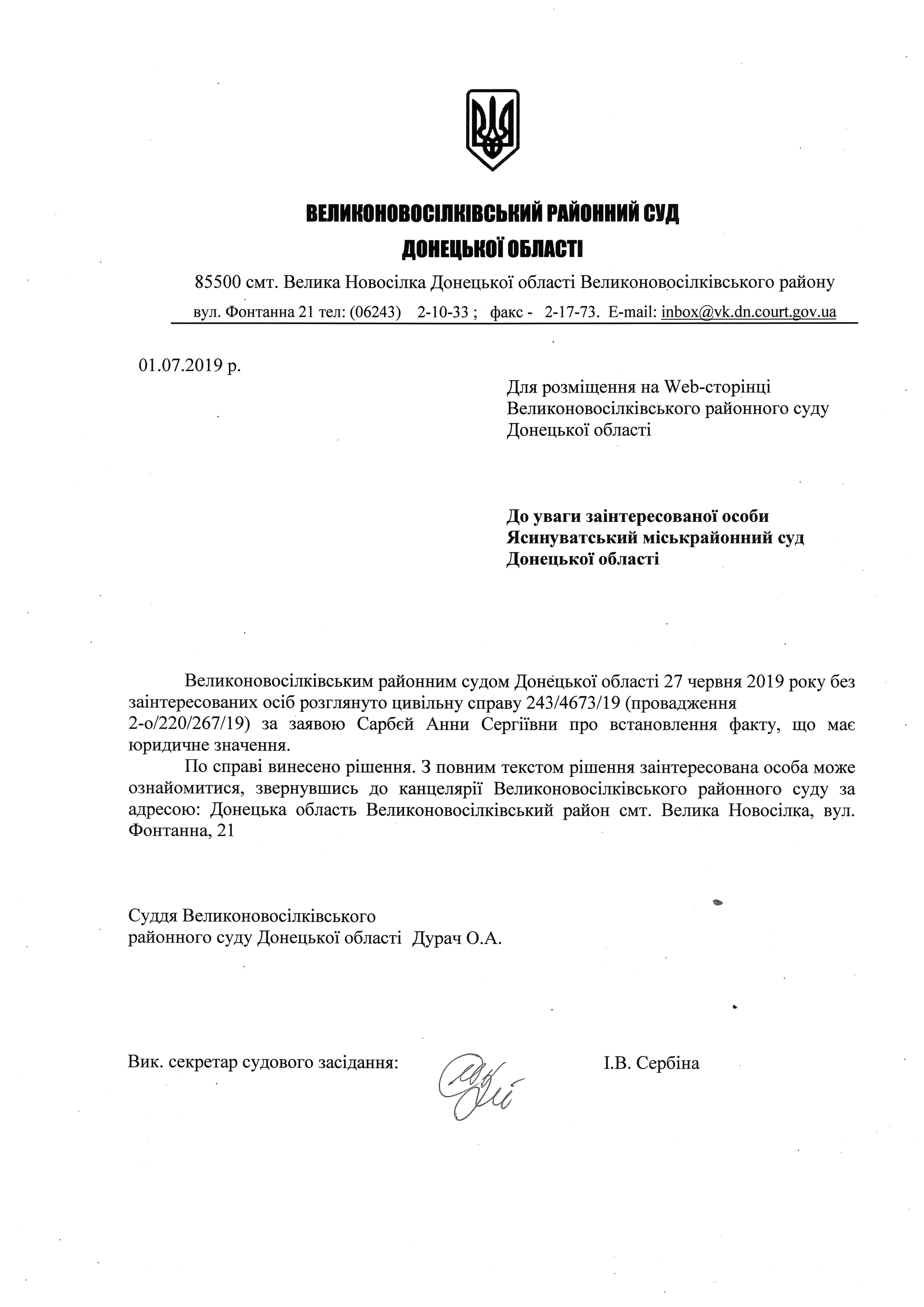 До уваги Ясинуватський міськрайонний суд Донецької області