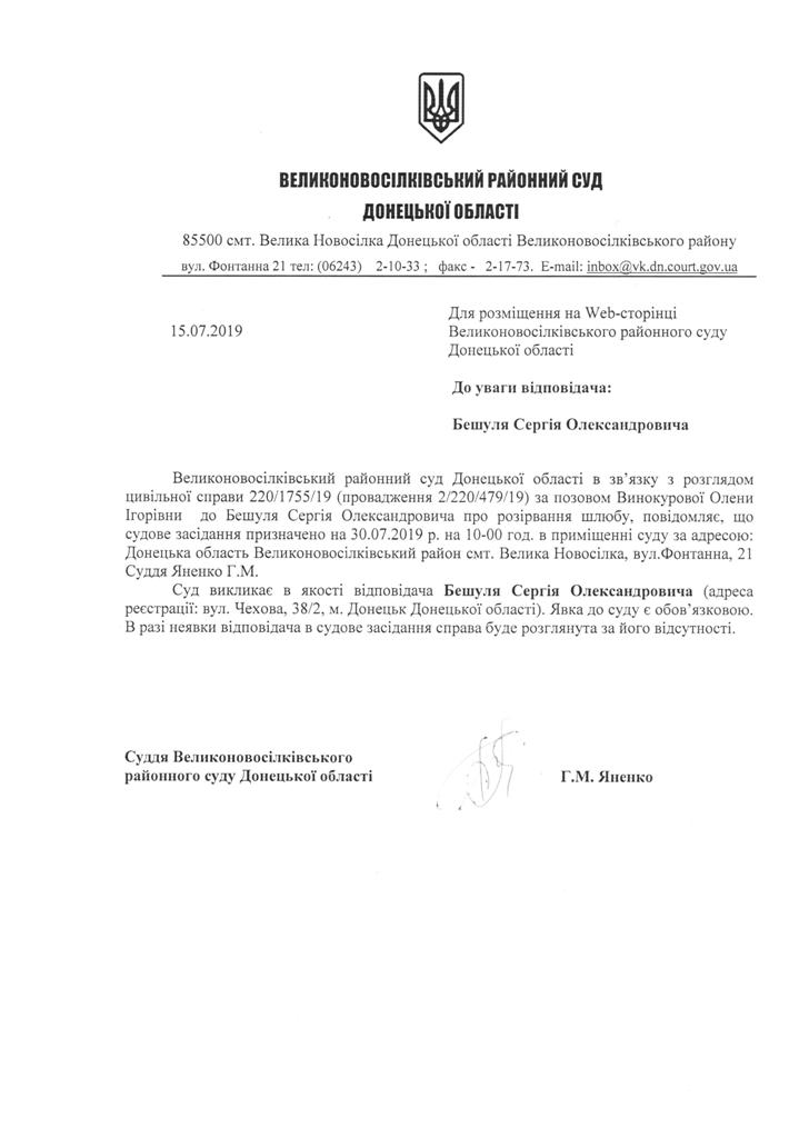 Оголошення про виклик до суду Бешуля С.О.