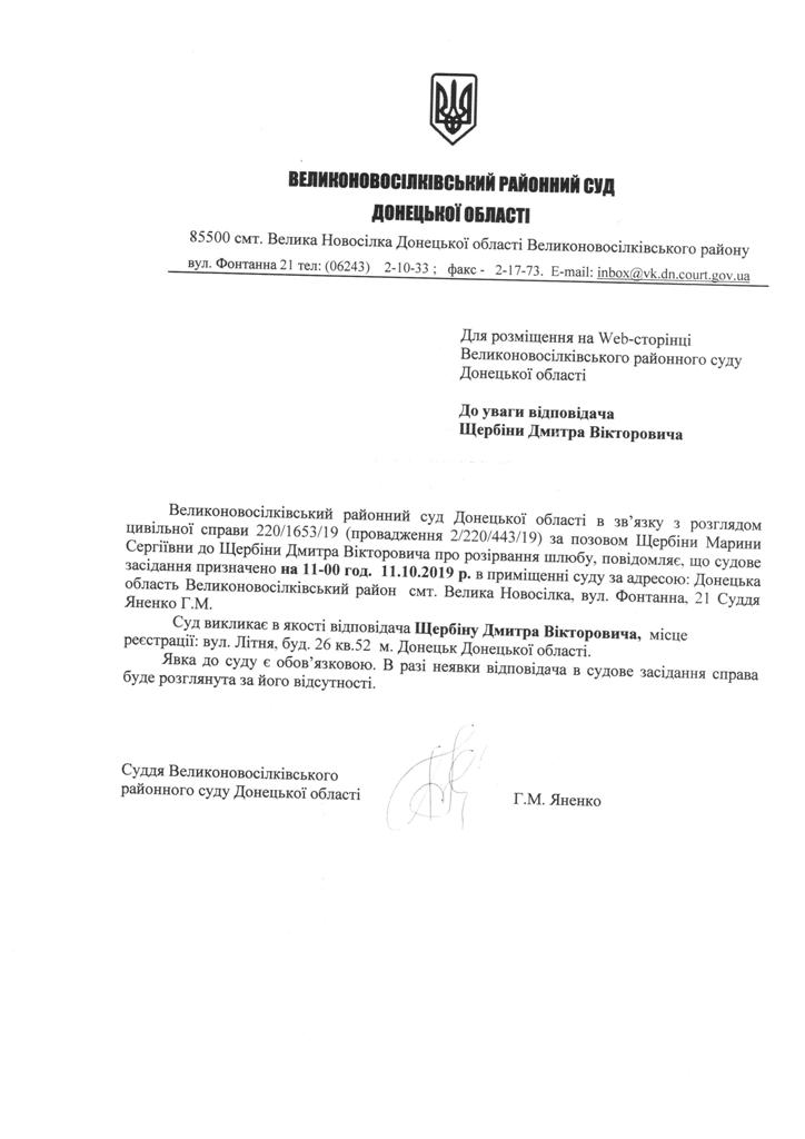 Оголошення про виклик до суду Щербіну Д.В.