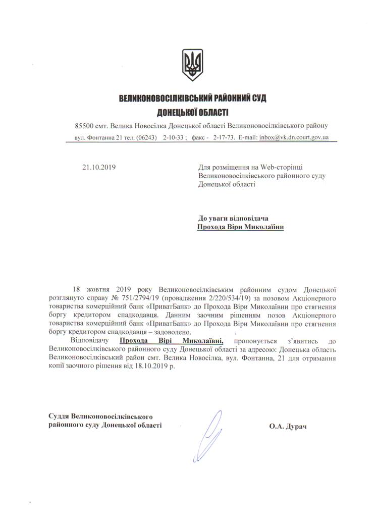 Оголошення для Проходи В.М. щодо отримання копії заочного рішення