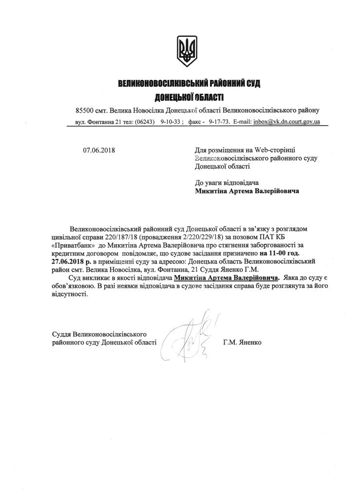 Оголошення про виклик до суду Микитіна А.В.